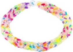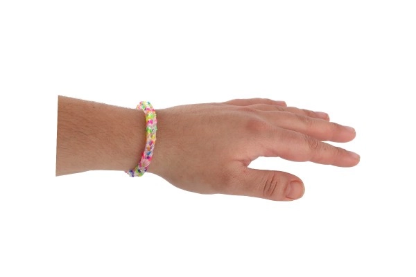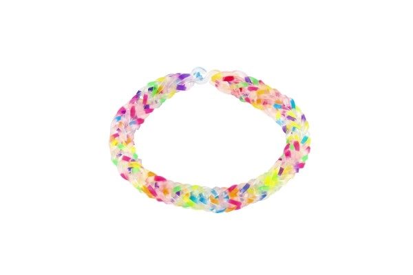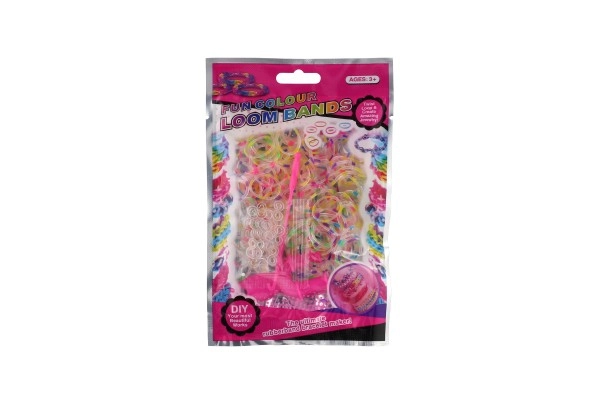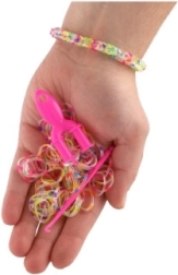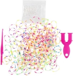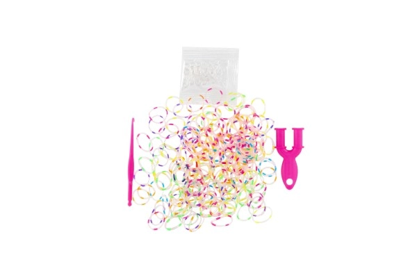 Komplektā ir viss nepieciešamais rokassprādžu izgatavošanai – 200 varavīksnes krāsu gumijas, āķītis un aizdares.