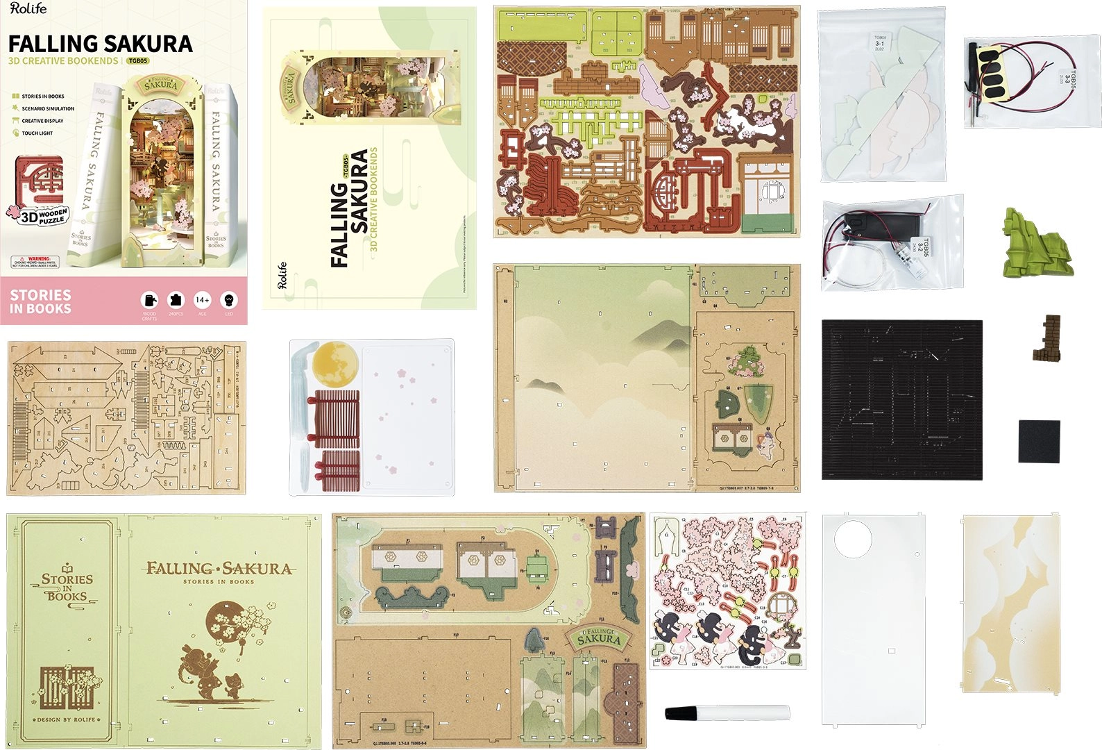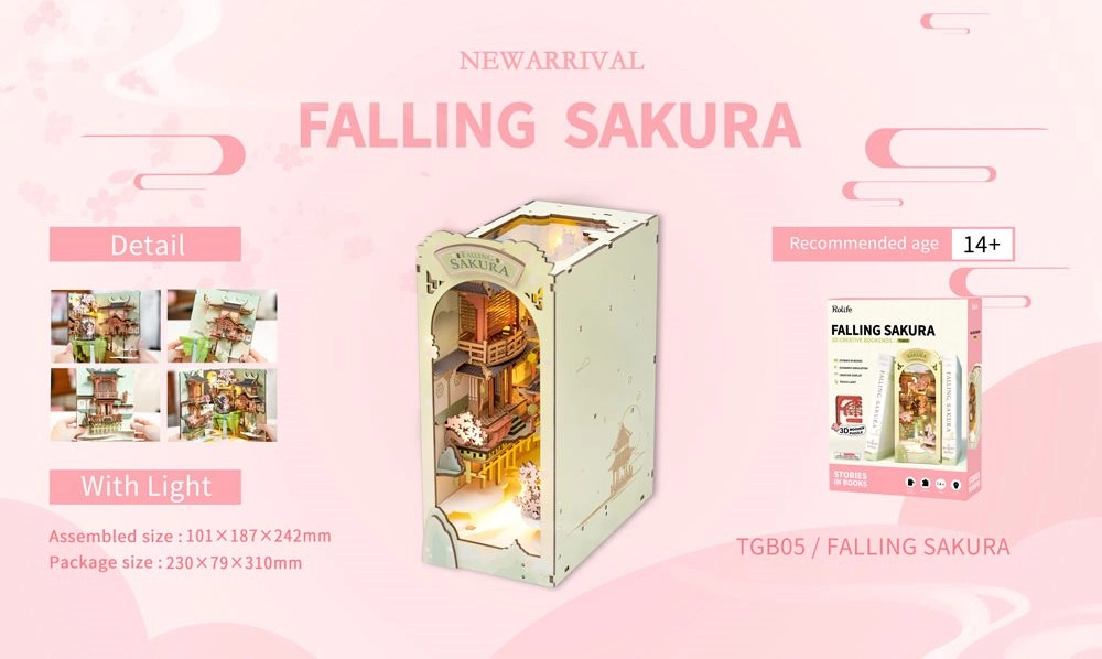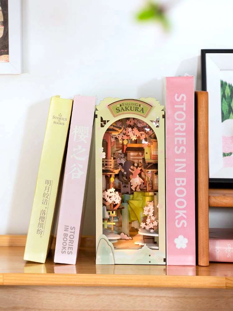 Pārvērtiet plauktu par poētisku pāreju starp grāmatām. Koka atdure FALLING SAKURA apvieno dekoratīvu diorāmu ar praktisku balstu grāmatām. Pateicoties LED apgaismojumam siltā tonī, izceļas smalkās japāņu arhitektūras un ķiršu ziedu detaļas, un vakara lasīšana iegūst jaunu dimensiju.