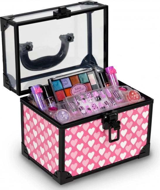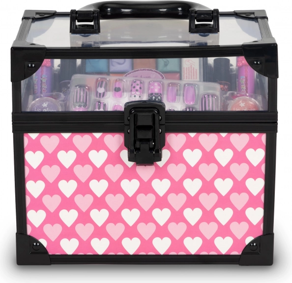 Koferītis ar caurspīdīgu vāku uztur visu kārtīgi sakārtotu, un pateicoties kompaktajiem izmēriem to ir viegli pārnēsāt. Komplektā ietilpst lūpu spīdumi, nagu lakas, lūpu krāsas, želejveida acu ēnu palete, gredzeni un uzlīmējamo nagu komplekts – perfekts aprīkojums radošam grimam un fantāzijas attīstīšanai.