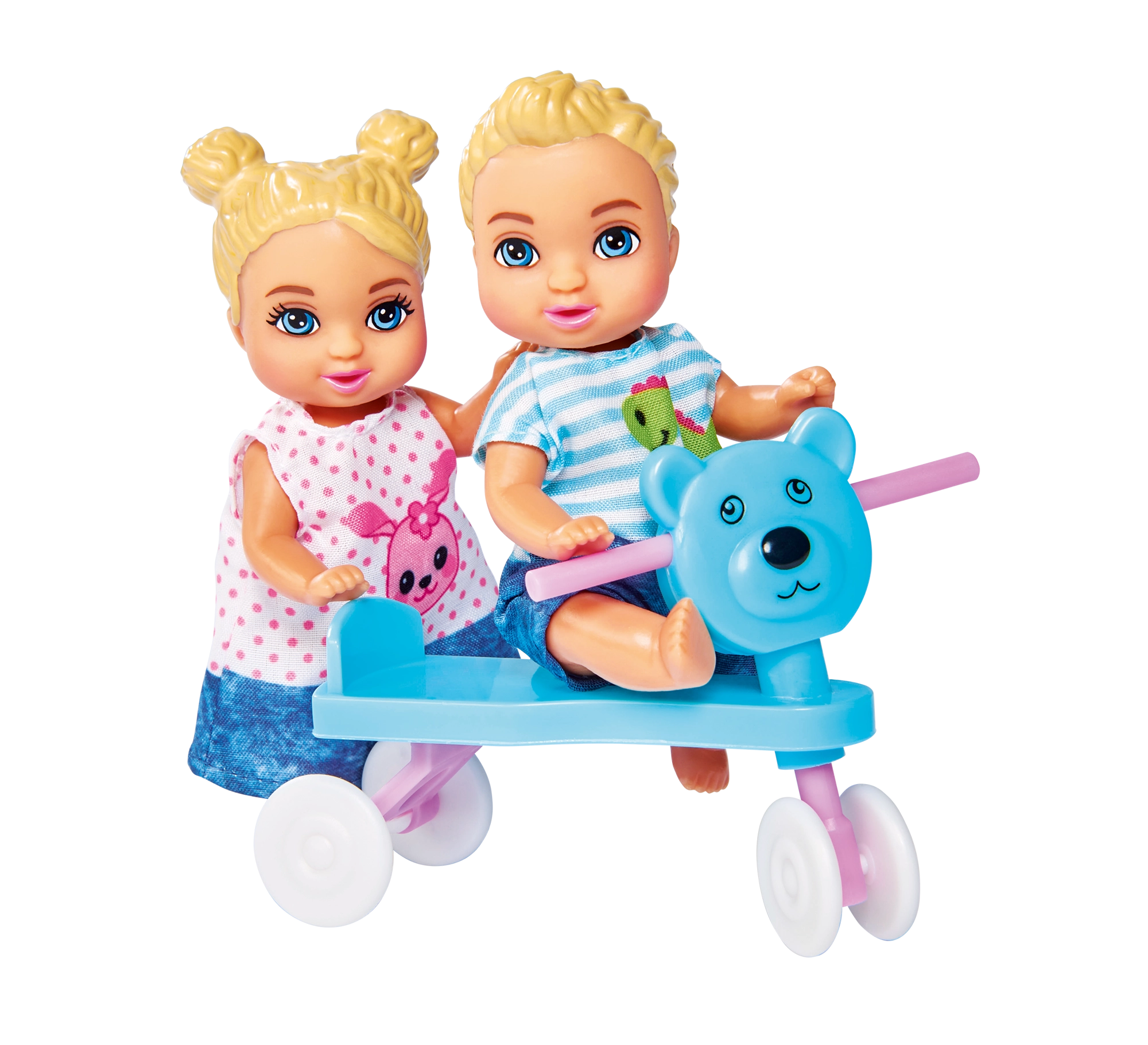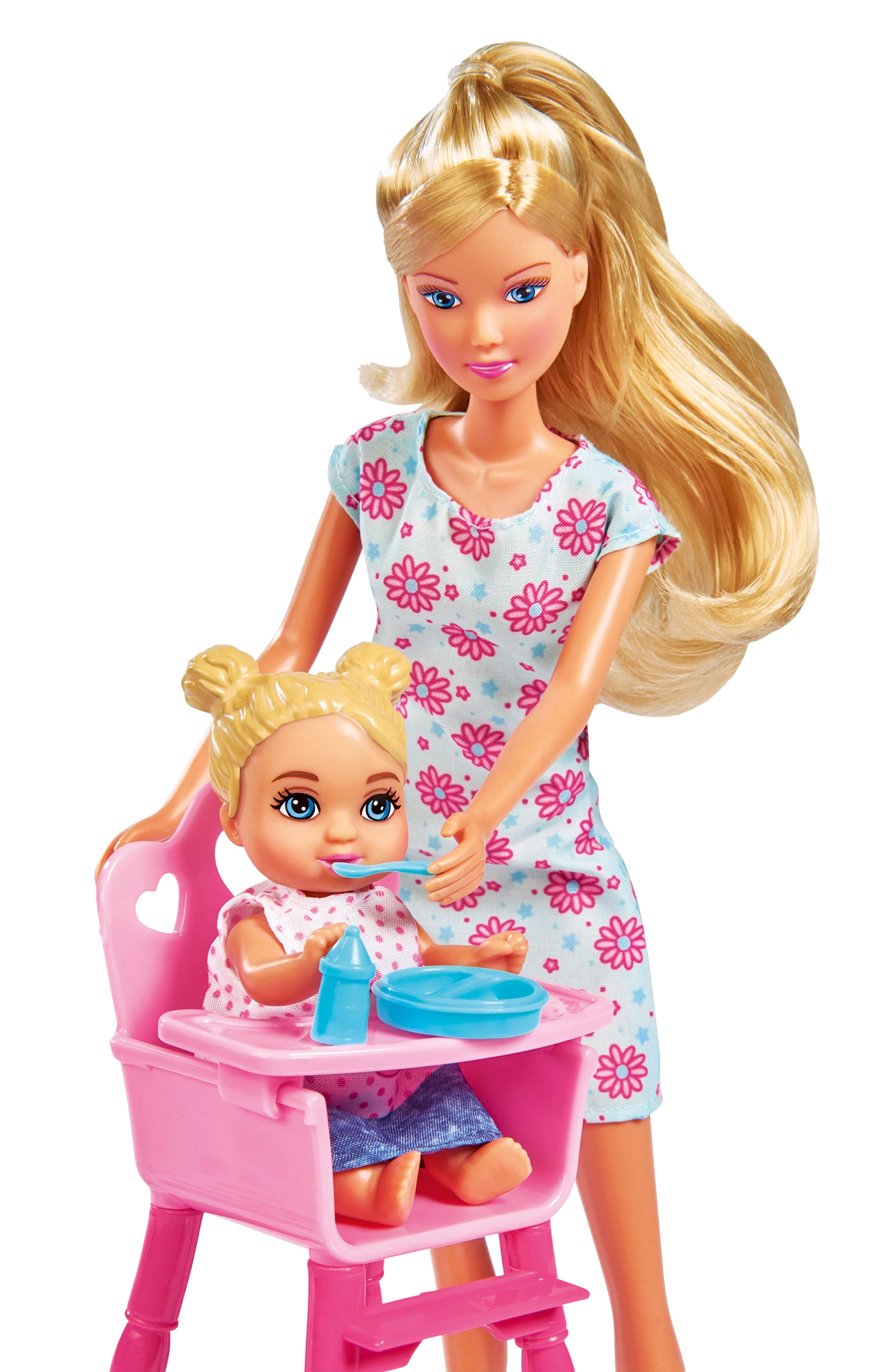- Lelle Steffi (māmiņa), 3 mazuļi, gultiņa/šūpulis, barošanas krēsliņš, 2 vienā ratiņi, nēsātava, atspole/skrejritenis, rotaļlietas un piederumi barošanai (pudelīte, bļodiņa, galda piederumi), knupītis, graužamriepas