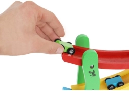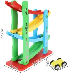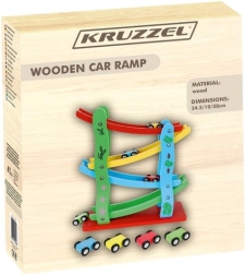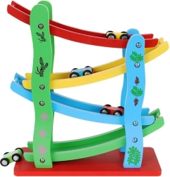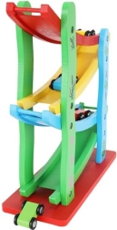 Komplektā ietilpst koka slidkalniņš ar 4 dažādu krāsu trasēm un 4 mašīnītes. Viss izgatavots no koka, kas nodrošina augstu drošības standartu.