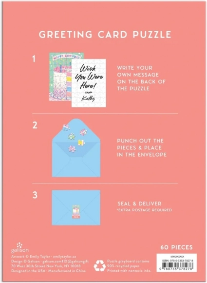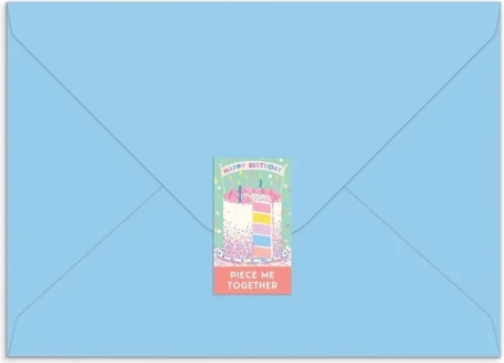 Pārsteidziet savus tuviniekus ar apsveikuma kartītes un puzles apvienojumu. Šī pastkartes formāta puzle attēlo skaistu kūku; uz aizmugures varat uzrakstīt personisku ziņu, to izjaukt pa gabaliņiem, ielikt iekļautajā aploksnē un nosūtīt kā dāvanu.