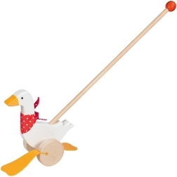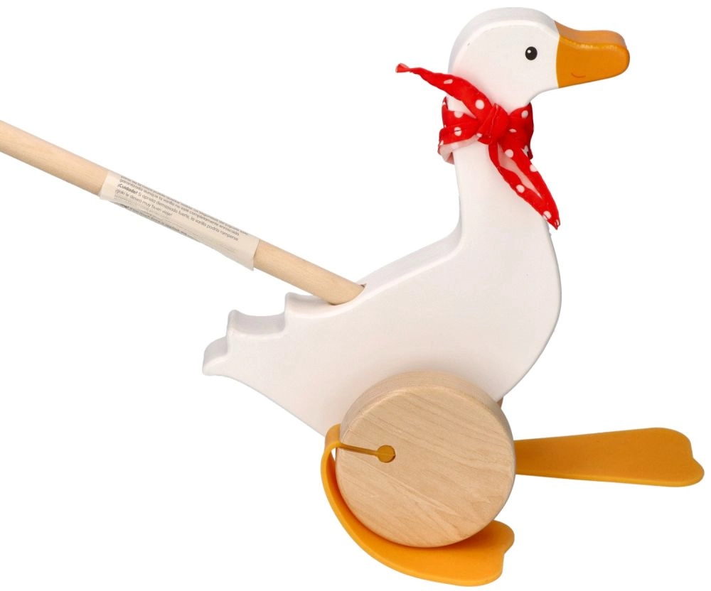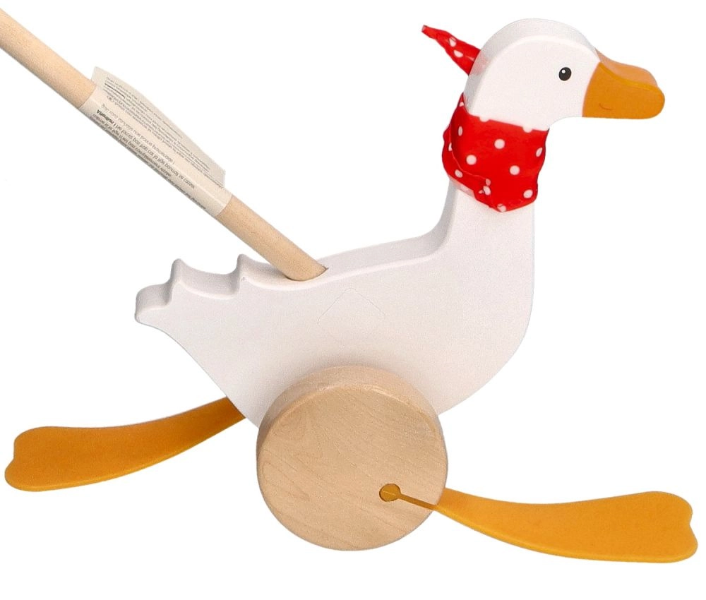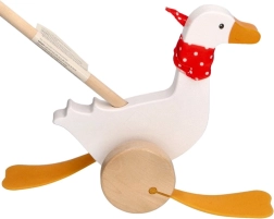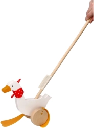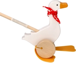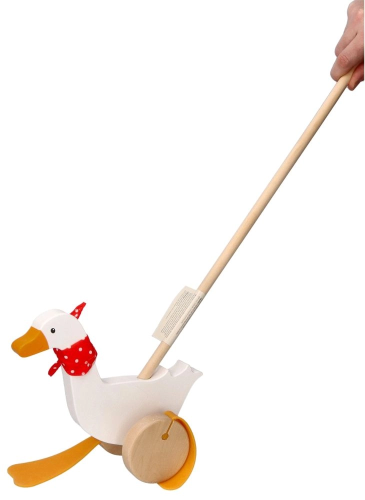 Bērnu zoss Berta no kvalitatīva koka priecē ar klasisku dizainu ar sarkanu punktotu lakatiņu un izteiksmīgām “pleznām”, kas stumšanas laikā mīlīgi kustas. Garais kāts atvieglo rotaļlietas vadīšanu un veicina bērnu aktīvu kustību.
