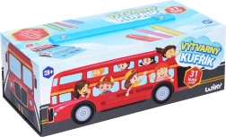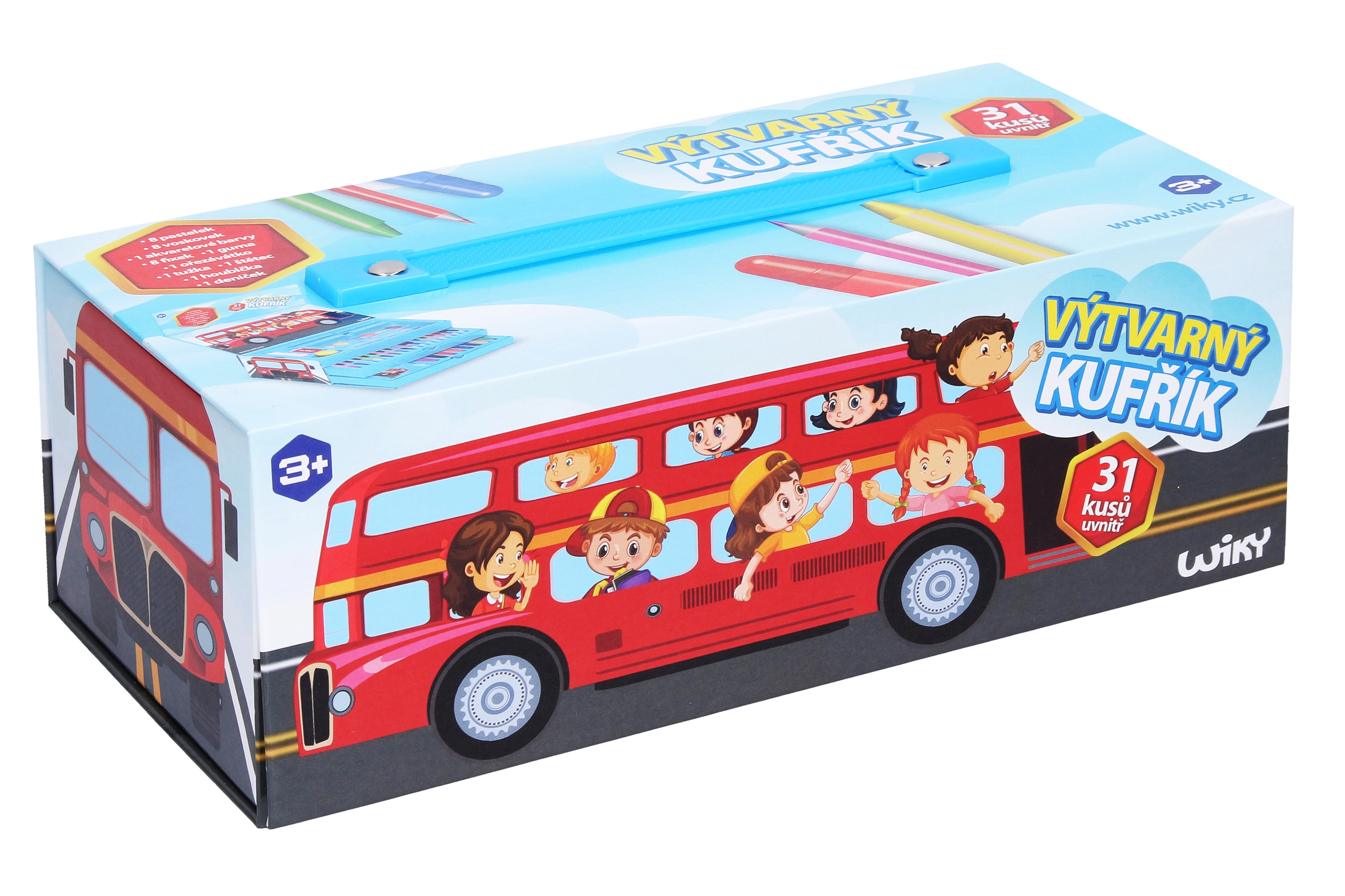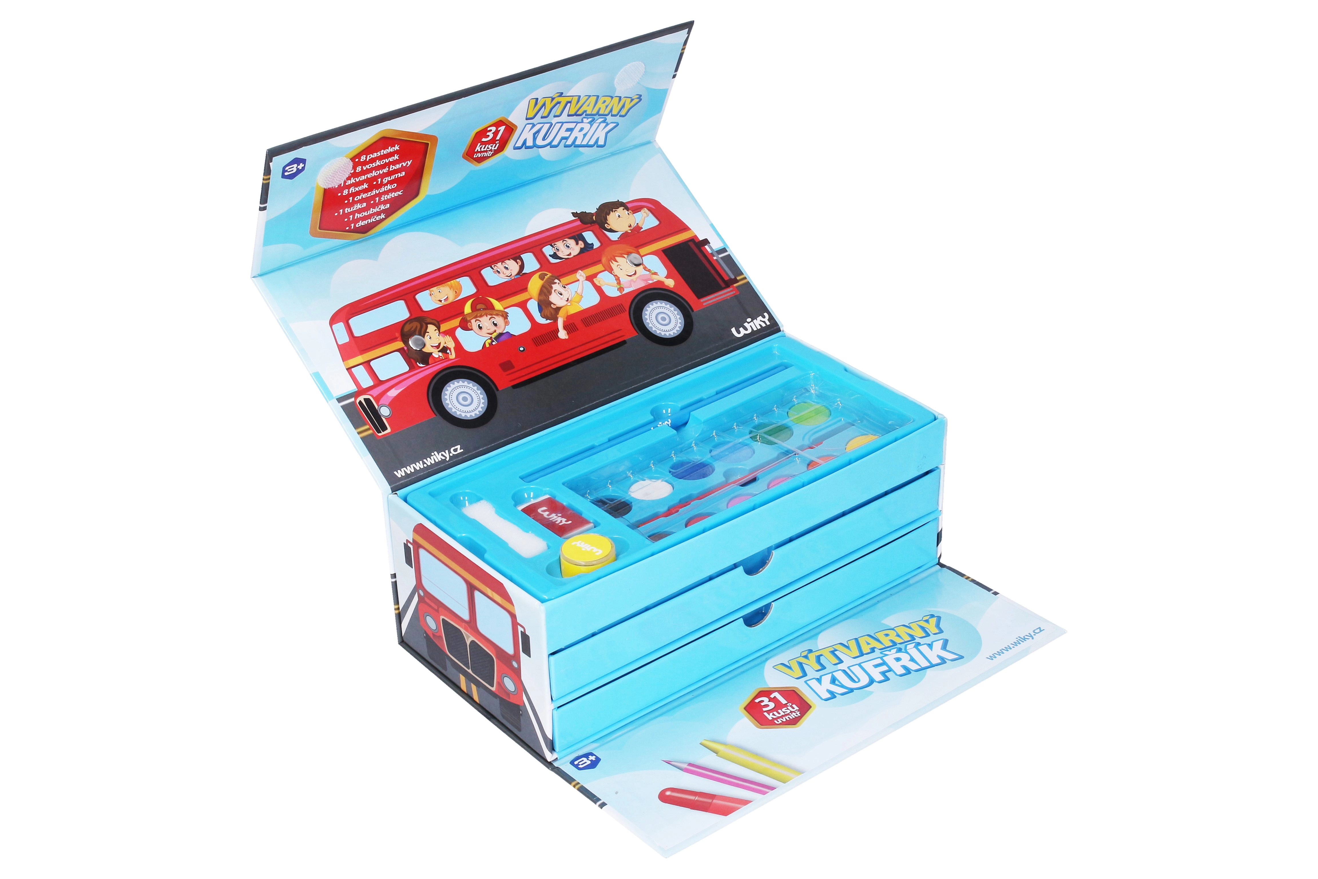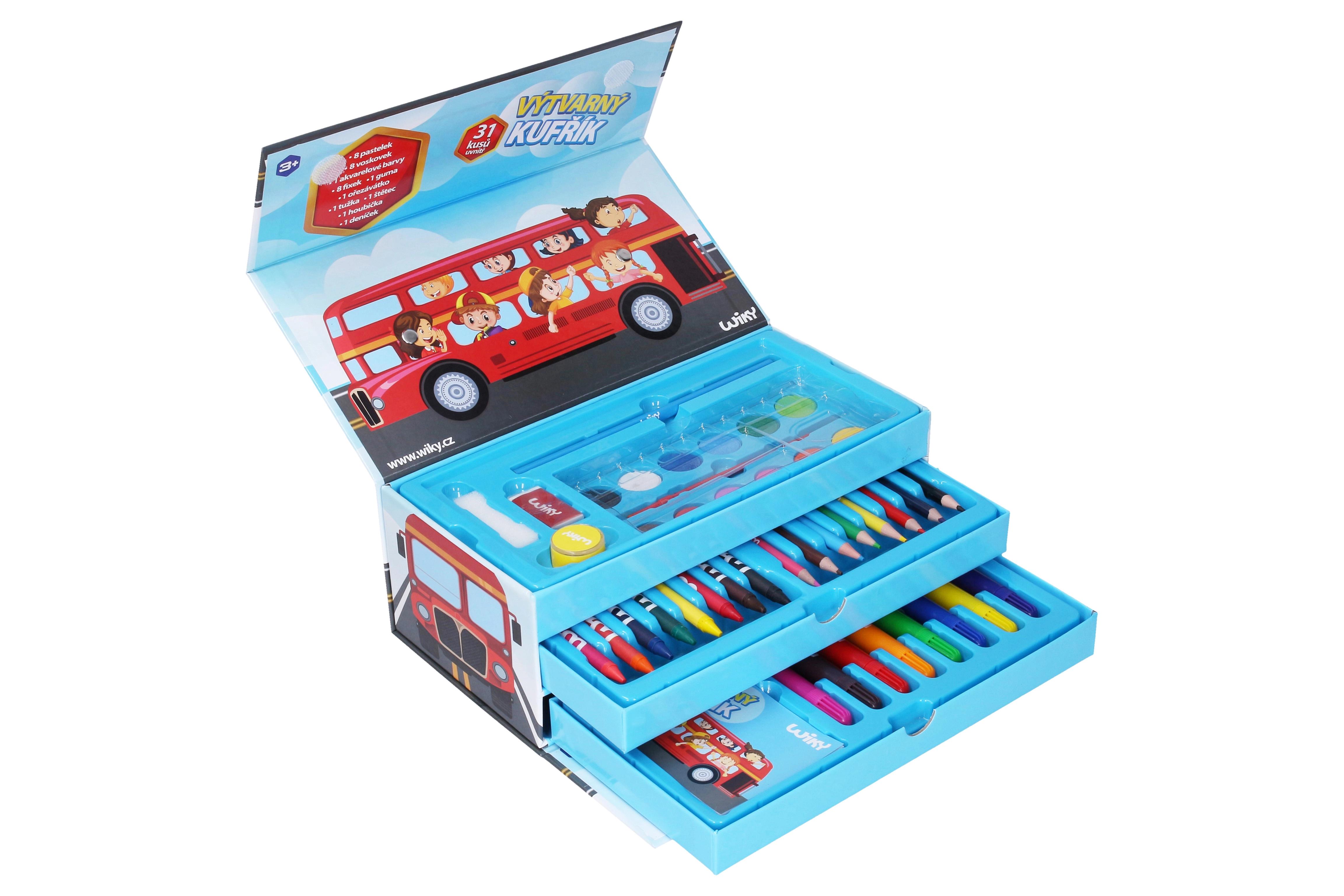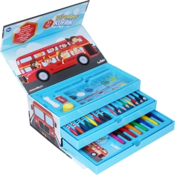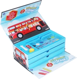 Viss, kas jaunajiem māksliniekiem nepieciešams, vienā praktiskā koferī ar autobusa motīvu: 31 gab. mākslas piederumu – krītiņi, vaska krītiņi, flomāsteri, akvareļkrāsas, dzēšgumija, asināmais, zīmulis, ota, sūklītis un piezīmju blociņš. Ideāli ceļā un mājās, kā arī lieliska dāvana radošiem bērniem.