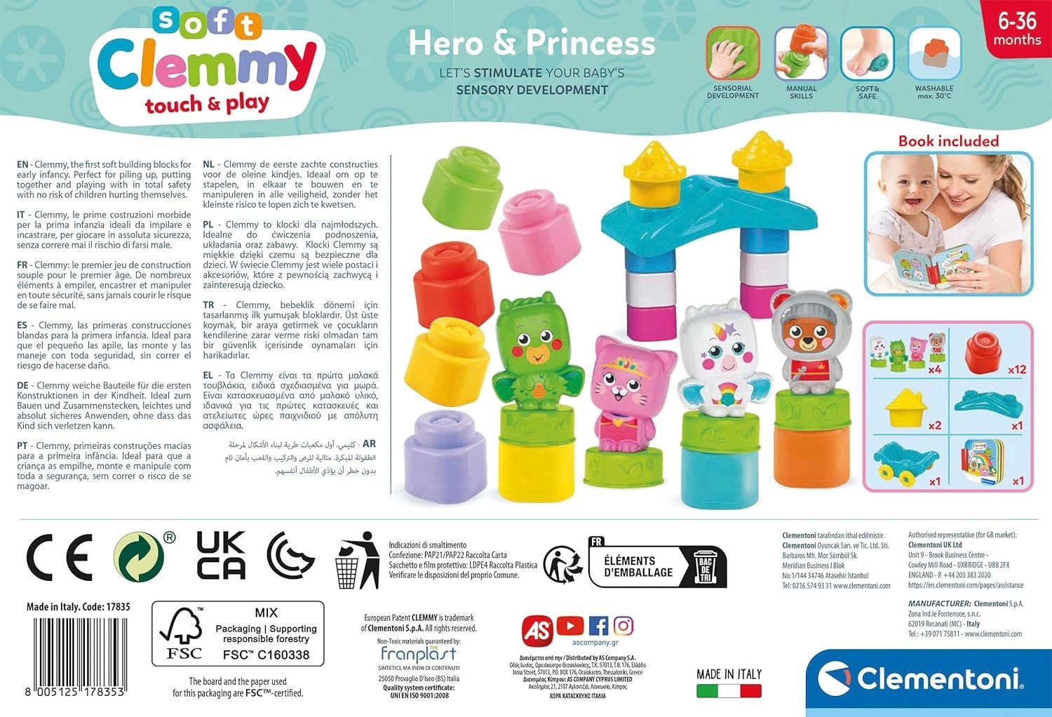 Šis lielais Soft Clemmy rotaļu komplekts ir ideāla izvēle pirmajām būvēšanas un maņu rotaļām. Mīkstos klučus ir viegli spiest, likt citu uz cita un droši pētīt, padarot tos par perfekti piemērotu rotaļlietu mazuļiem. Ilustrētā kartona grāmatiņa un bruņinieka un princeses motīvs rosina stāstu stāstīšanu un valodas attīstību.