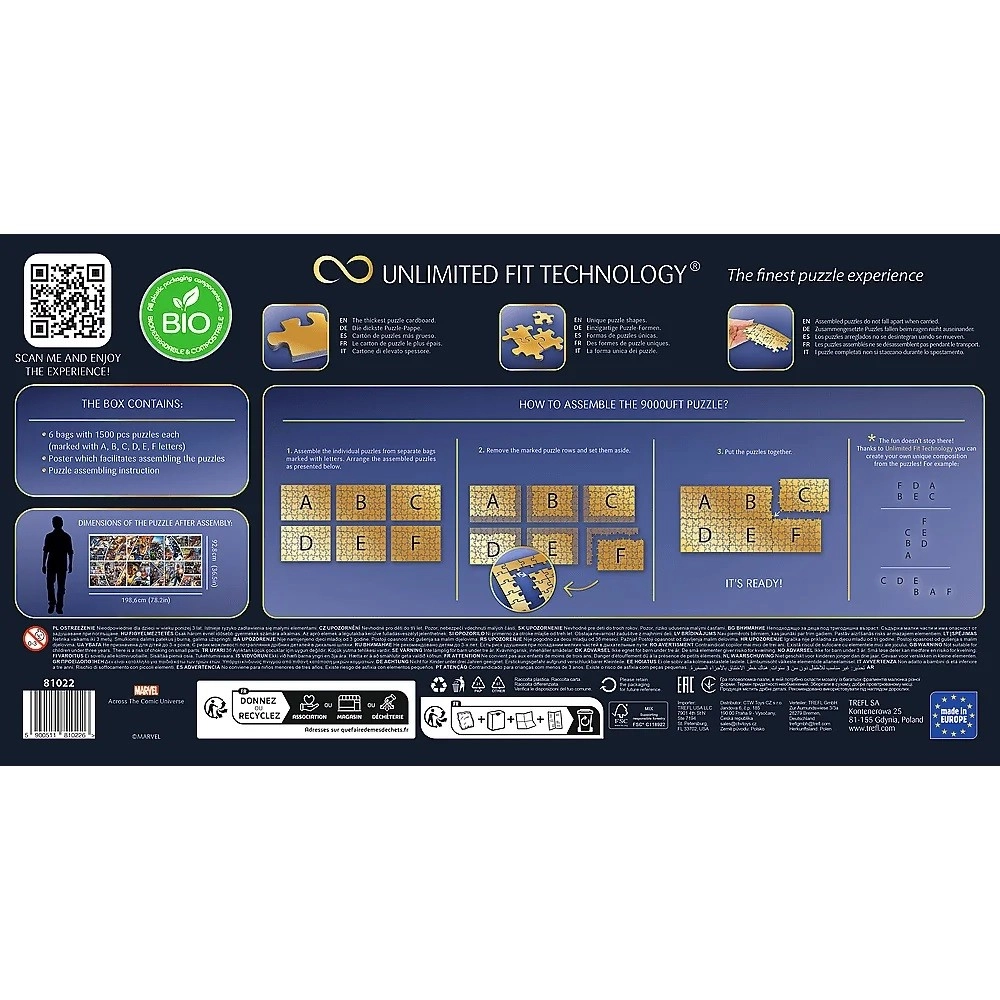 6 puzles paneļus (katrs ar 1500 gabaliņiem) var apvienot milzīgā attēlā pēc pievienotā plakāta vai ļaut vaļu iztēlei un izveidot savu kompozīciju! Puzles ir lielisks treniņš atmiņai, roku prasmju attīstībai, kā arī koncentrēšanās, pacietības un vērīguma vingrinājums. Ideāla dāvana pužļu cienītājiem, pieaugušajiem un bērniem no 12 gadu vecuma. Kopējais salikuma izmērs pēc mūsu priekšlikuma ir 198,6 x 92,8 cm*.