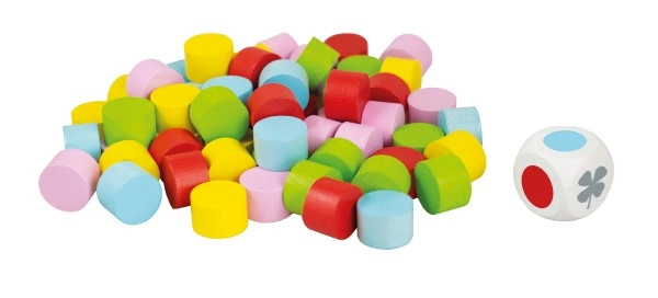 - Satur kartona spēles plāksni, krāsainus koka ruļļveida kauliņus un metamo kauliņu.