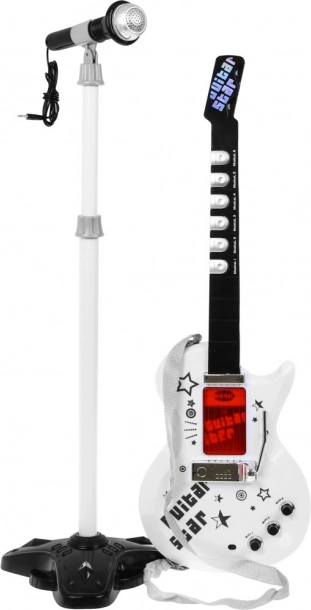 Bērnu elektriskā ģitāra ar mikrofonu ir lielisks starts mūzikas pasaulē. Komplekts apvieno vienkāršu lietošanu ar aizraujošām funkcijām, lai motivētu bērnus dziedāt un spēlēt instrumentu. Pateicoties regulējamam statīvam un mikrofona skaļuma regulēšanai, mazie mākslinieki var uzstāties kā uz īstas skatuves.