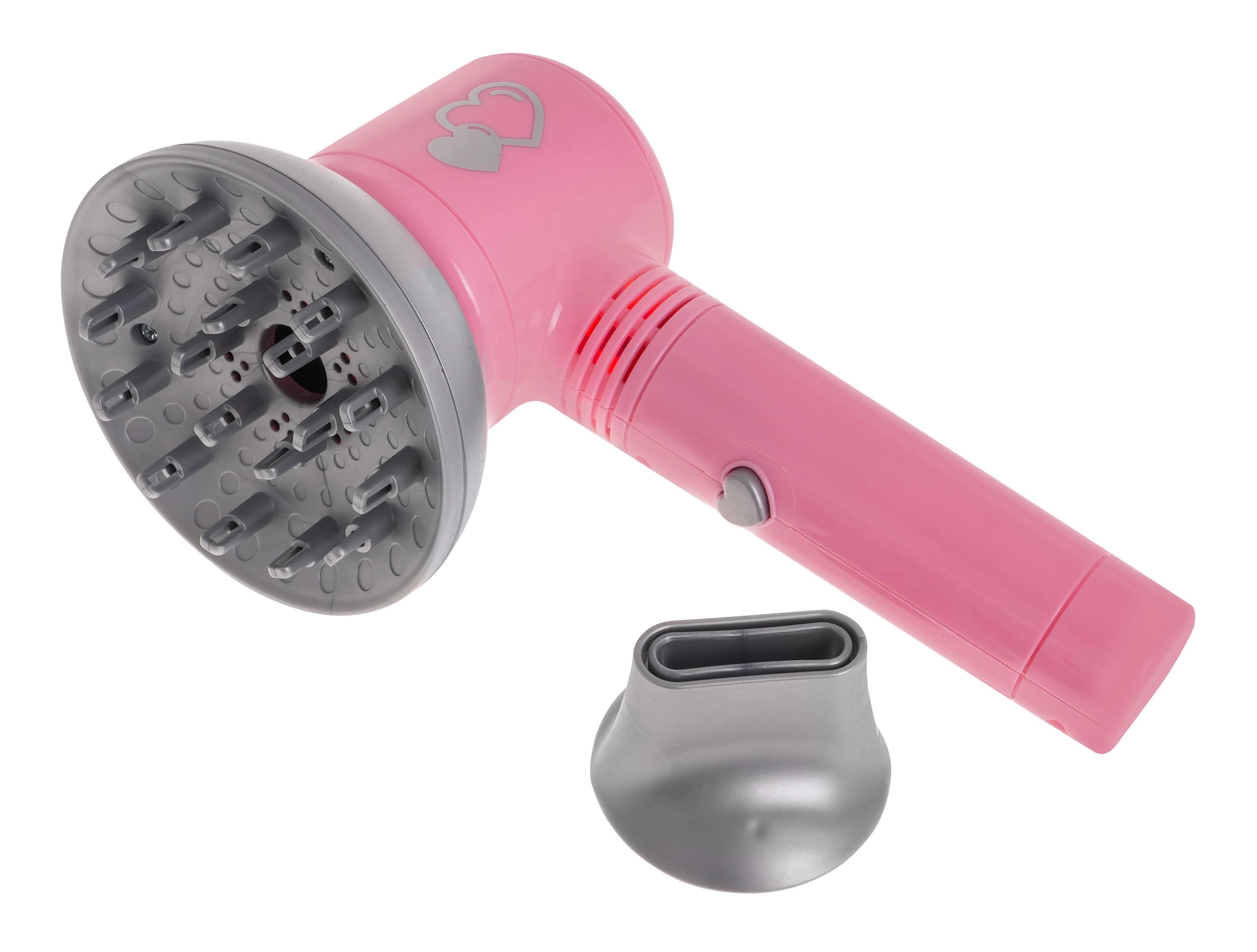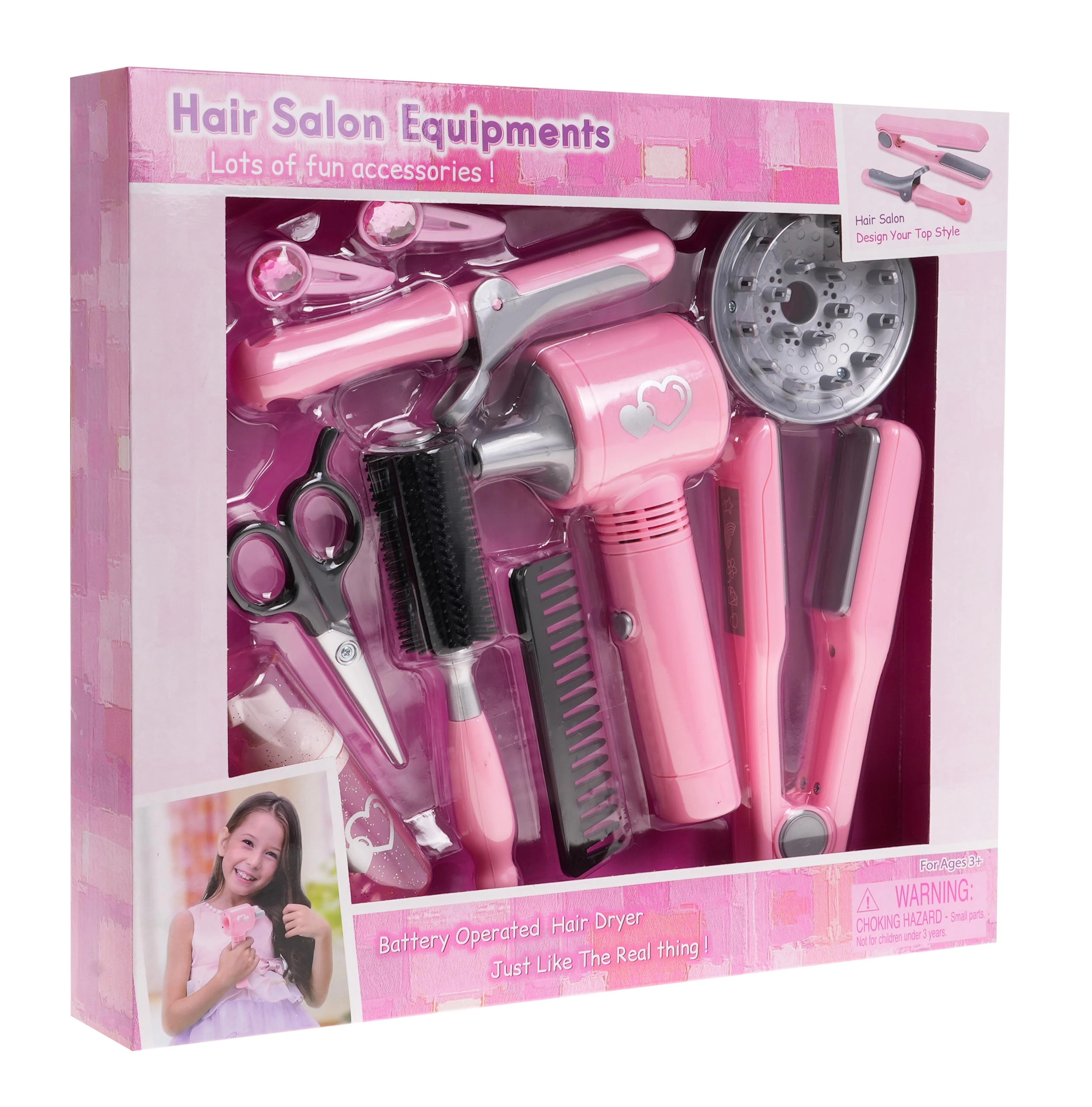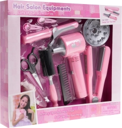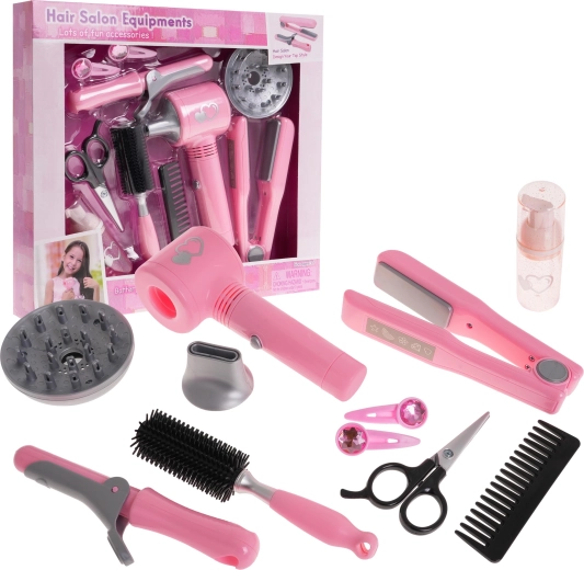 Bērnu friziera instrumentu komplektā ir viss, kas nepieciešams mazajai frizierei pirmajiem matu ieveidošanas mēģinājumiem. Fēns darbojas ar baterijām un nodrošina maigu gaisa plūsmu, kas uzticami imitē īstu matu žāvēšanu. Tam ir arī divi maināmi uzgaļi — difuzors un koncentrators.