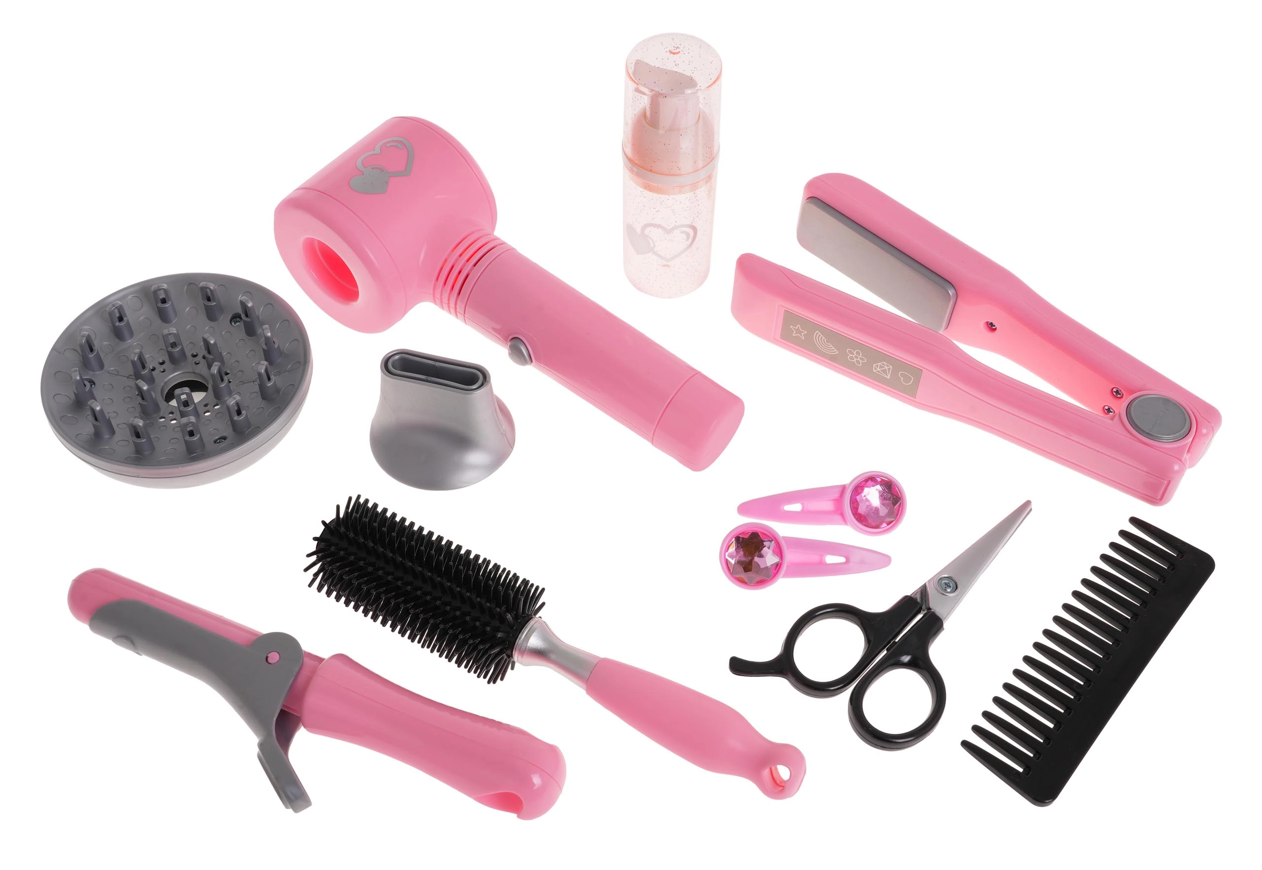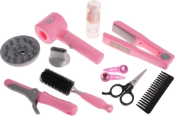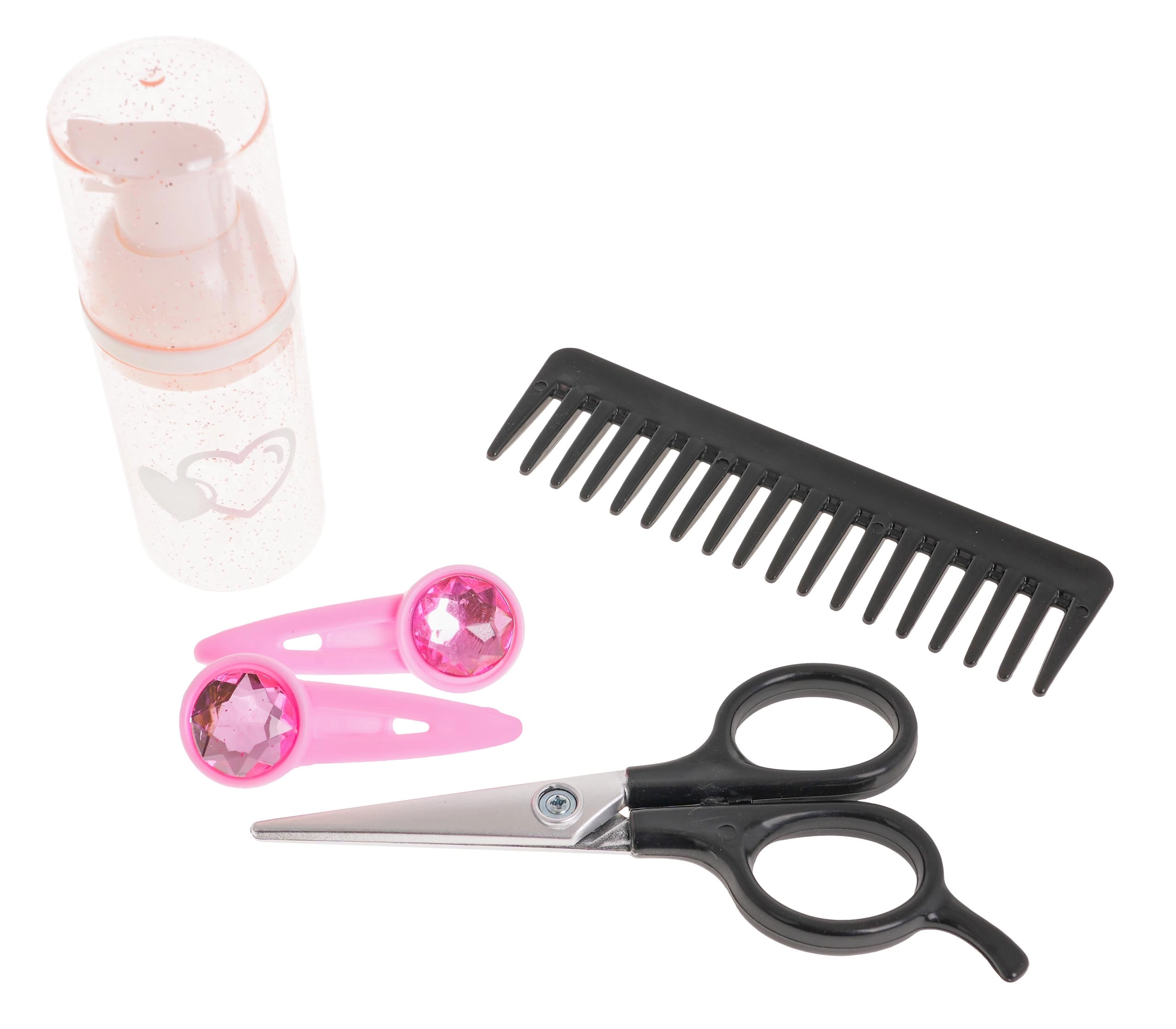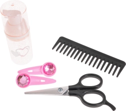 Komplektā ietilpst arī lokšķēres un matu taisnotājs, ķemmīte, suka, šķēres, pudelīte un matu sprādzes — viss nepieciešamais radošai spēlēšanai.