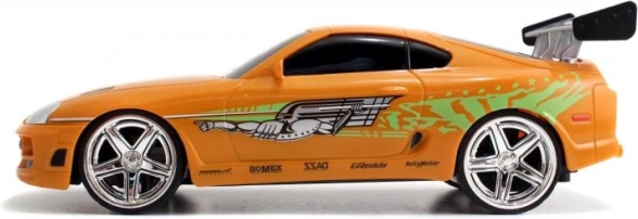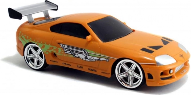 Detalizēta oranža Toyota Supra, iedvesmota no BRIANA auto filmā ĀTRI UN BEZ ŽĒLASTĪBAS, ar autentiskām uzlikām un aizmugurējo spārnu.