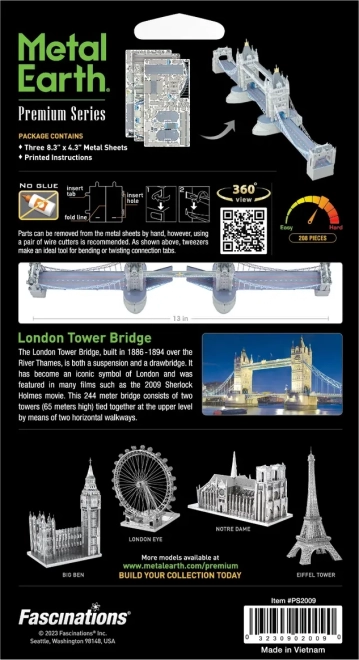 Premium klases metāla 3D pužļu komplekts METAL EARTH uzticami ataino Tower Bridge ar raksturīgajiem torņiem un paceļamajiem laidumiem. Pateicoties lāzergravēšanai, izceļas reālistiskas tekstūras un arhitektoniskie elementi, kas padara modeli par pievilcīgu akcentu plauktā vai vitrīnā.