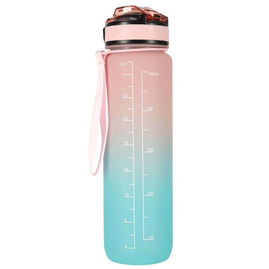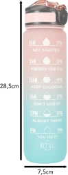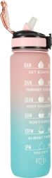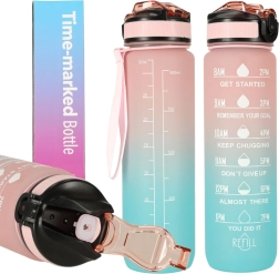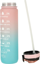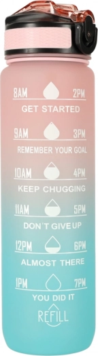Stilīga 1 l Tritan pudele ar rozā–zilu pāreju palīdz ievērot dzeršanas režīmu, pateicoties motivējošām laika atzīmēm. Tai ir atverams vāciņš ar slēdzeni, integrēts salmiņš ērtai dzeršanai bez slīpināšanas un viegls, izturīgs materiāls bez BPA.