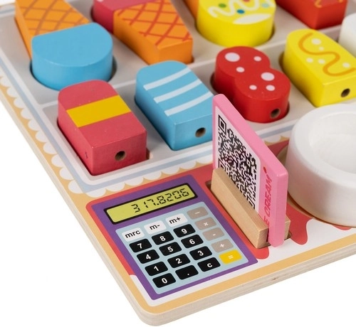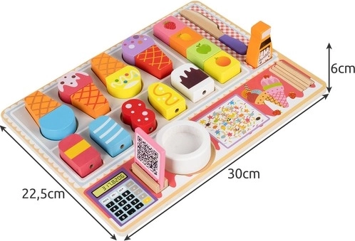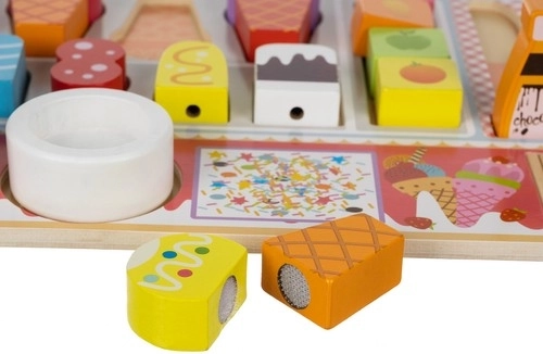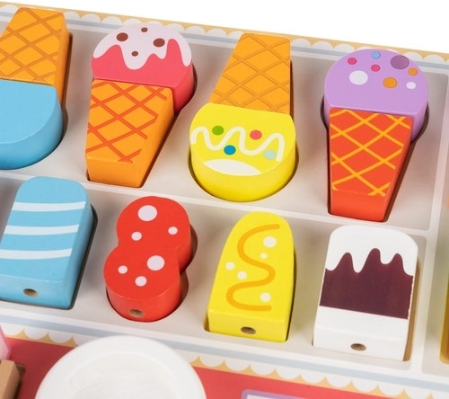 Šis stilīgais koka saldējuma kiosks bērniem sniedz autentisku saldumu veikala noskaņu. Pateicoties košajām krāsām un daudzajām saldējuma kombinācijām, bērni mācās atpazīt krāsas, formas un izmērus un dabiski attīsta kognitīvās un sensorās prasmes. Koka elementi ērti iegulst mazajās rociņās un veicina pareizu satvērienu un pacietību, veidojot bumbiņas un saldējumus uz kociņa.