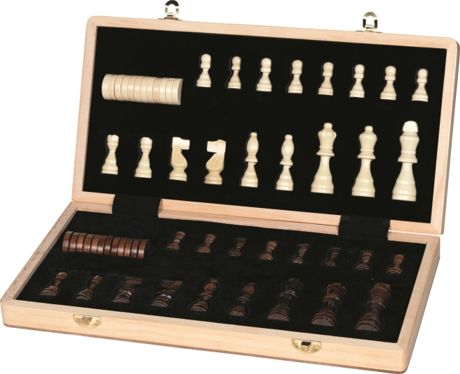 Praktiska koka šaha dēlīte salokās kompaktā koferītī ar siksniņām/aizdarēm; iekšpusē droši varat novietot visas figūras.