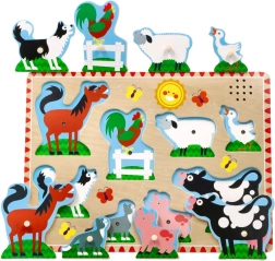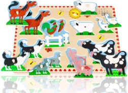 Aizraujoša un izglītojoša koka puzle bērniem ar saimniecības dzīvnieku motīvu. Pateicoties krāsainajiem gabaliņiem un ērtai satveršanai, bērni apgūst dzīvnieku atpazīšanu un attīsta sīko motoriku.