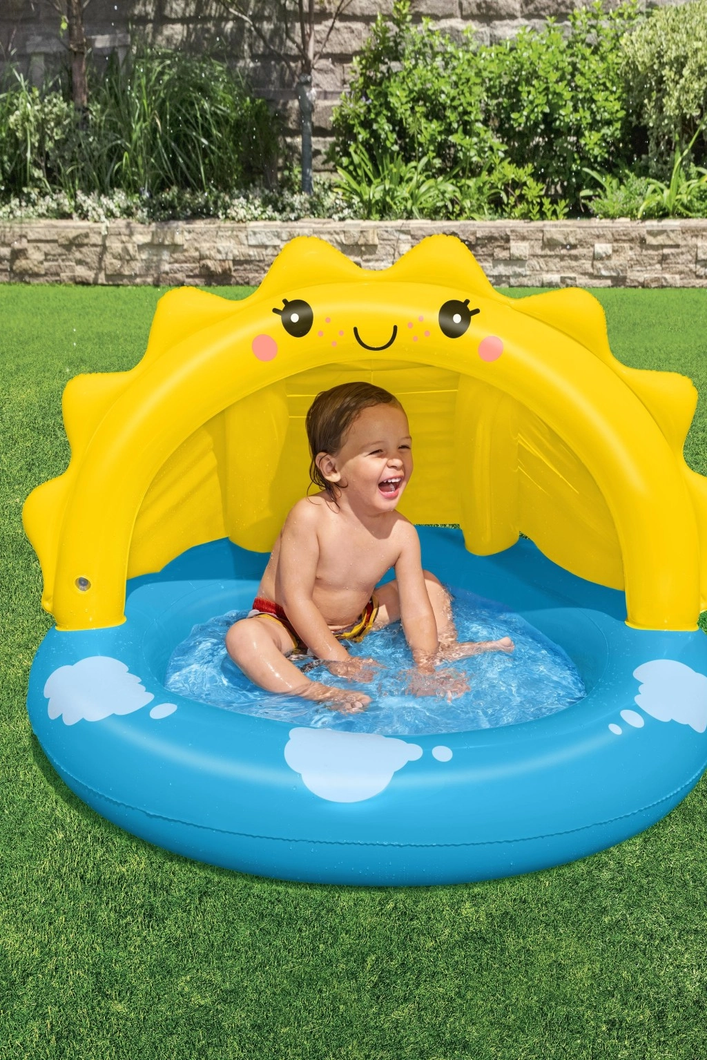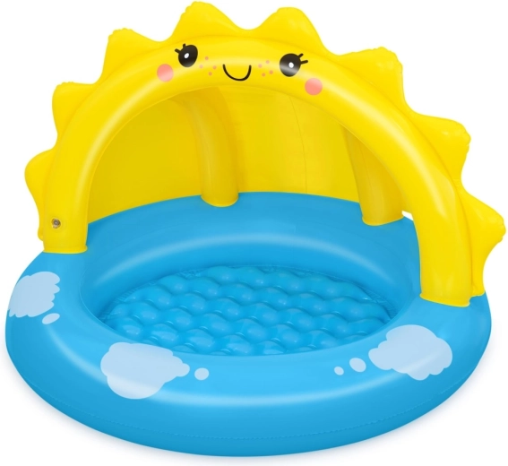 Uzpūšamais baseins ar jumtiņu SAULĪTE ir lieliska izvēle bērnu pirmajām ūdens rotaļām. Jautrais dizains ar smaidošu saulīti un mākonīšiem iepriecinās mazos peldētājus, savukārt integrētais UV jumtiņš nodrošinās patīkamu ēnu. Mīksta, teksturēta grīda palielina sēdēšanas komfortu un drošību rotaļu laikā.