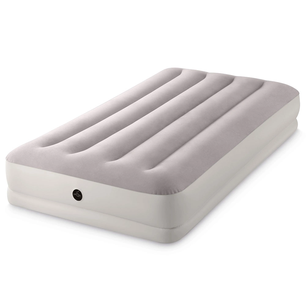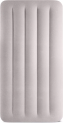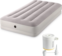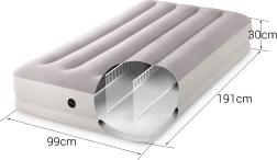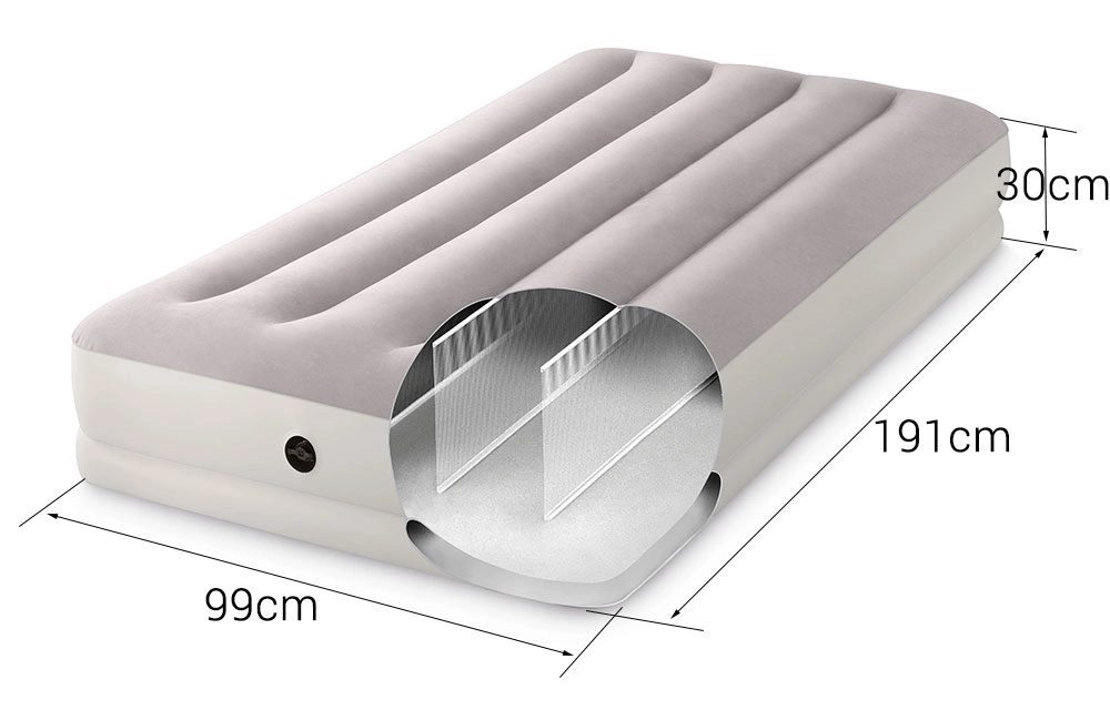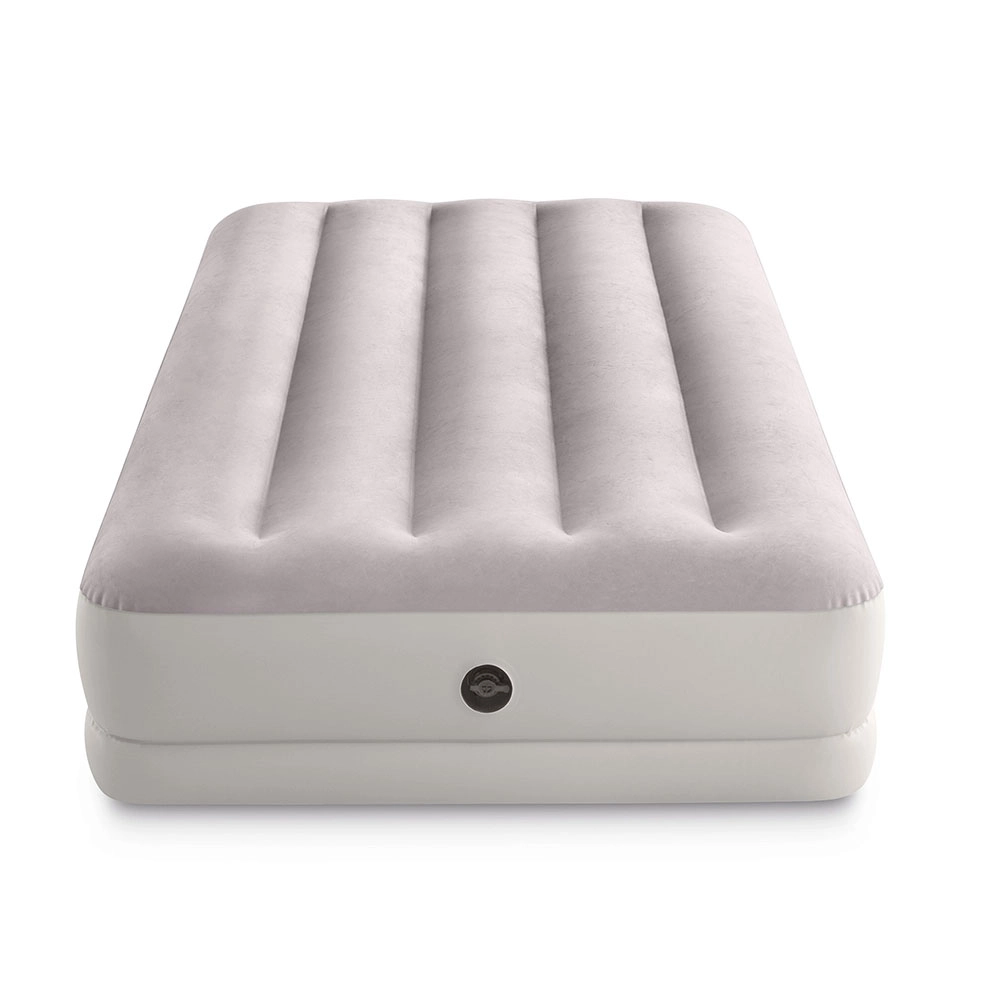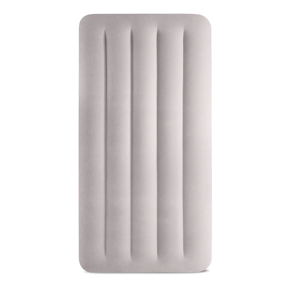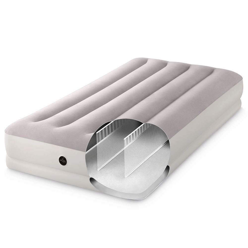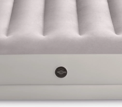 Uzpūšamā gulta INTEX apvieno izturīgu PVC materiālu ar mīkstu flokētu virsmu, kas ir patīkama pieskārienam un uzlabo miega komfortu. Paaugstinātā konstrukcija ar gareniskām kamerām un iekšējām stiprinājuma šķiedrām nodrošina stabilitāti bez šūpošanās efekta un uzticamu mugurkaula atbalstu.