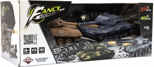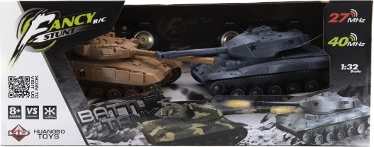 Izbaudiet aizraujošu tanku kauju ar diviem RC tankiem mērogā 1:32 – katrs darbojas atšķirīgā frekvencē 27/40 MHz vienmērīgai cīņai. Jūs sagaida 360° rotējošs tornis, reālistiski šāvienu skaņu efekti un gaismas efekti. Komplektā ietilpst uzlādējami akumulatoru bloki un lādētāji, pults darbības rādiuss līdz 15 m, bet viena brauciena ilgums apmēram 10–15 minūtes. Piemērots no 8 gadu vecuma.
