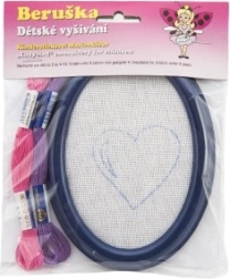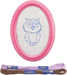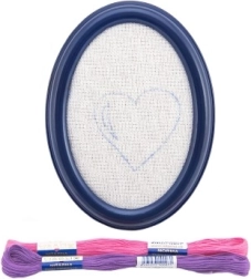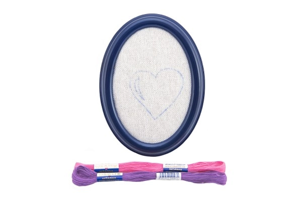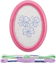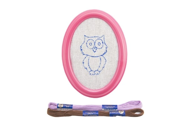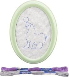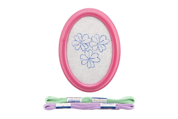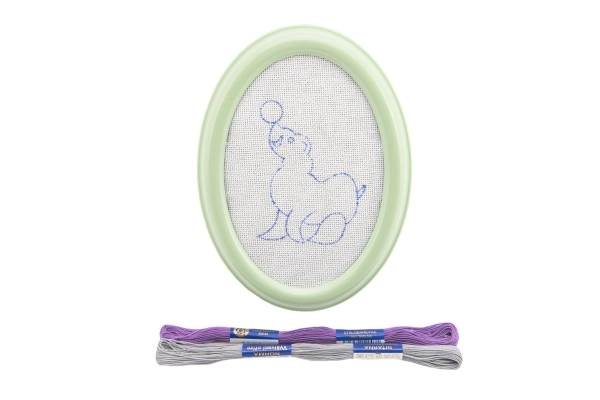 - Plastmasas rāmītis ar nostieptu audumu un iepriekš uzdrukātu attēlu, vēl divi papildu paraugi izšūšanai, diegas