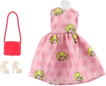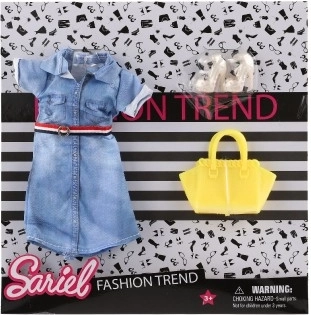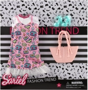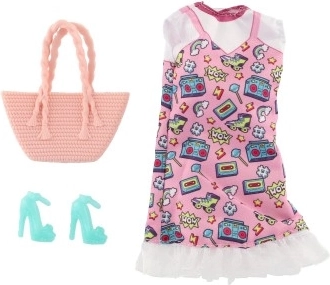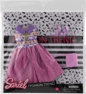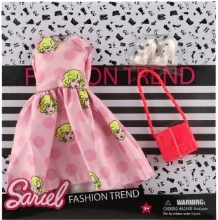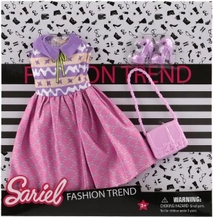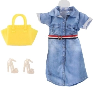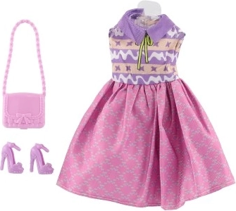 Iepakojumā ir viss nepieciešamais – kleitas, kurpes un rokassoma, lai tava lelle izskatītos nevainojami.