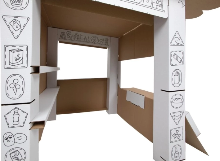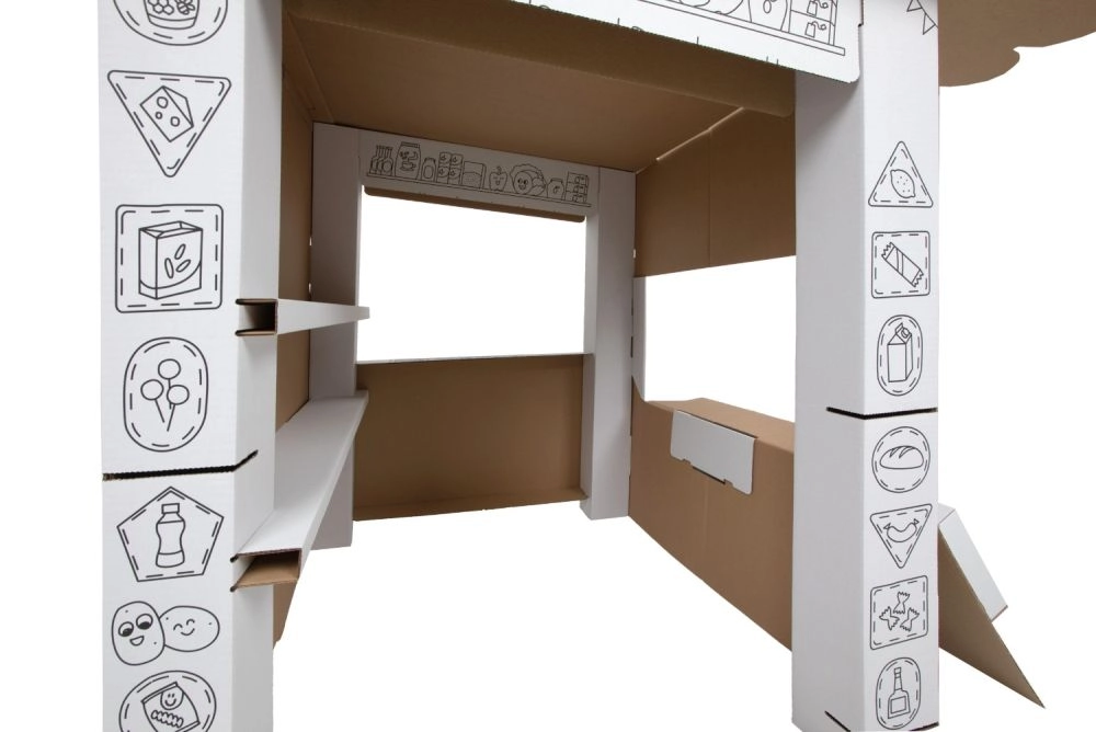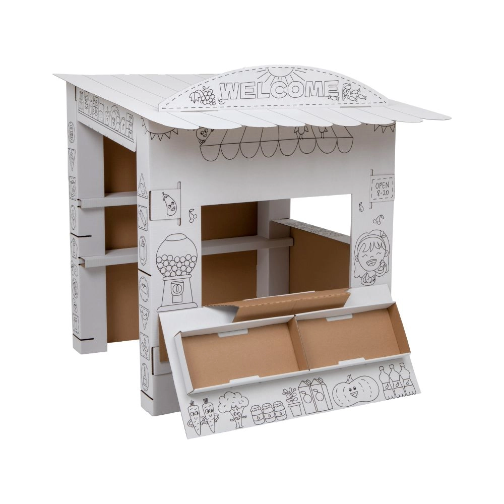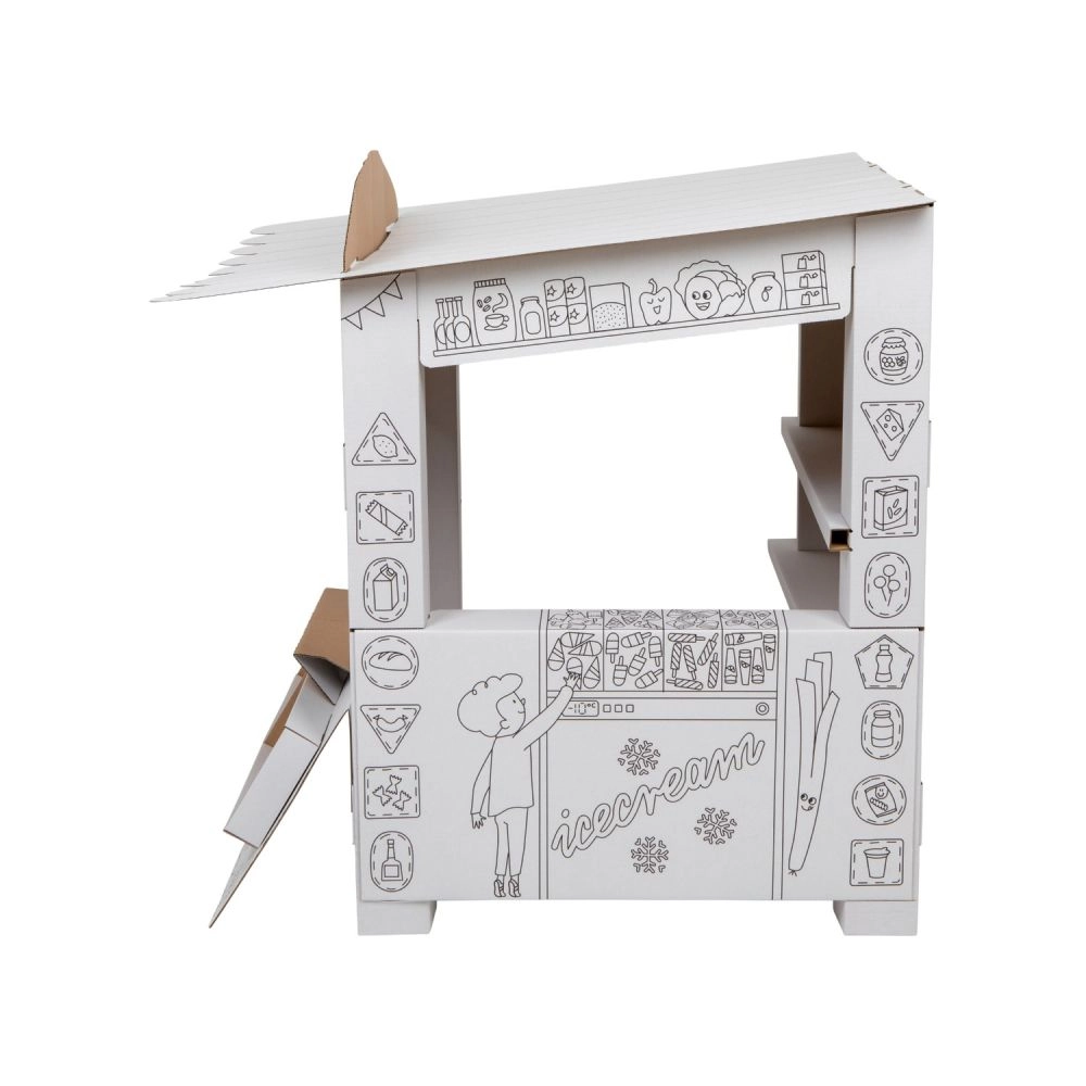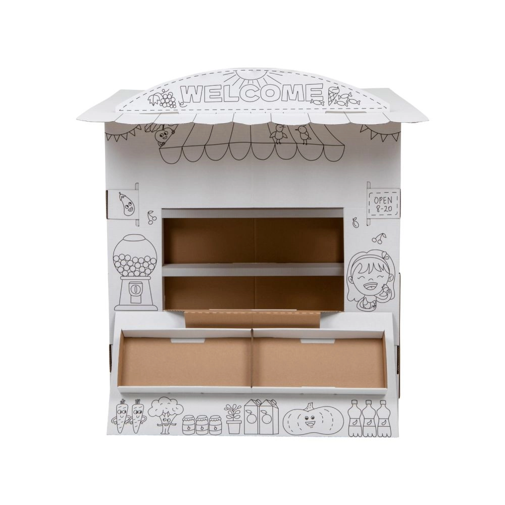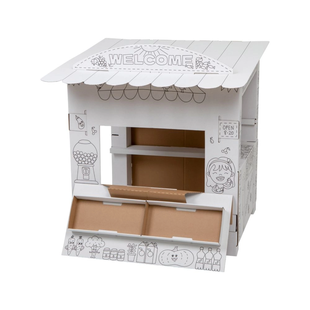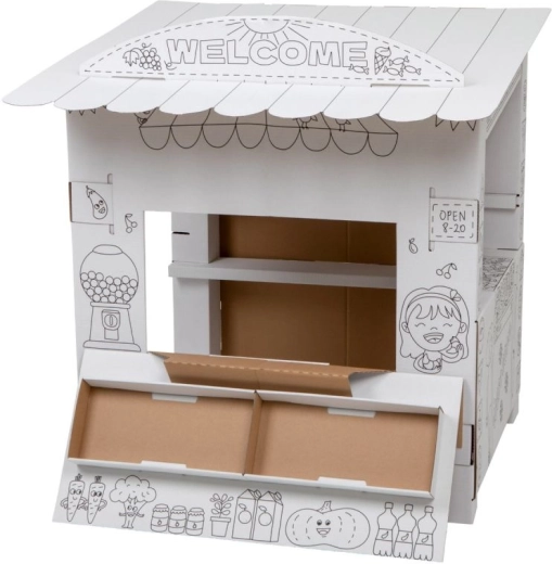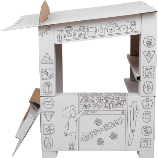 Šis kartona stends bērniem sniedz daudz izklaides un mācīšanās vienlaikus. Pateicoties melnbaltajām aprisēm, bērni to var izkrāsot ar krāsainajiem zīmuļiem, flomāsteriem vai vaska krītiņiem un izveidot savu oriģinālu veikala stendu. Atvērtā konstrukcija ar nolaižamu leti un iekšējiem plauktiem ir kā radīta pārdevēja un pircēja lomspēlei.