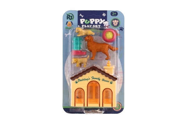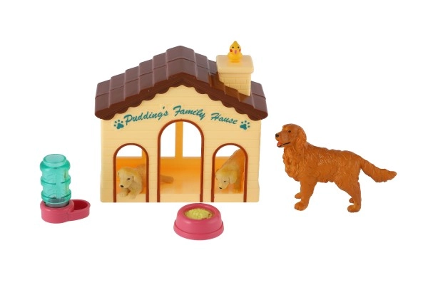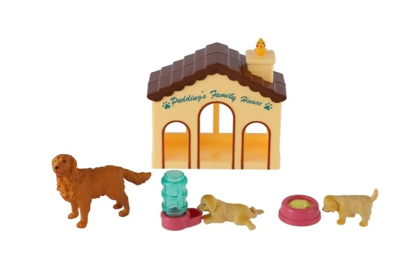 Komplektā ir divi kucēni, pieaudzis suns, barošanas bļoda un dzirdne – viss, kas nepieciešams realistiskai spēlei.