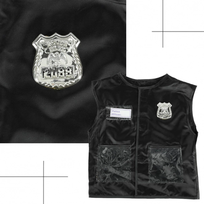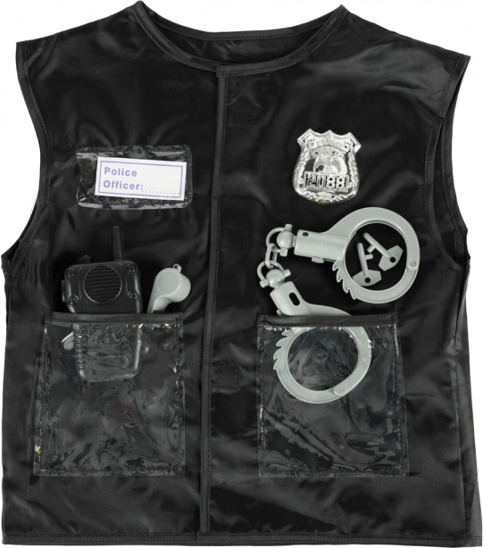 Vestē ir caurspīdīgas kabatas, sudrabains žetons un uzšuve “Police Officer”, kas ļauj bērniem sajusties kā īstiem policistiem.