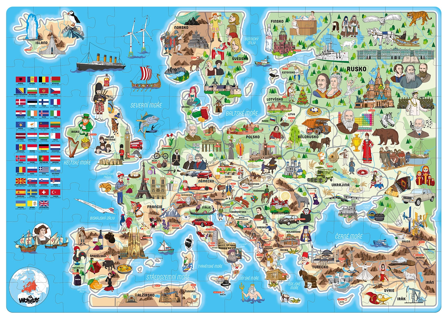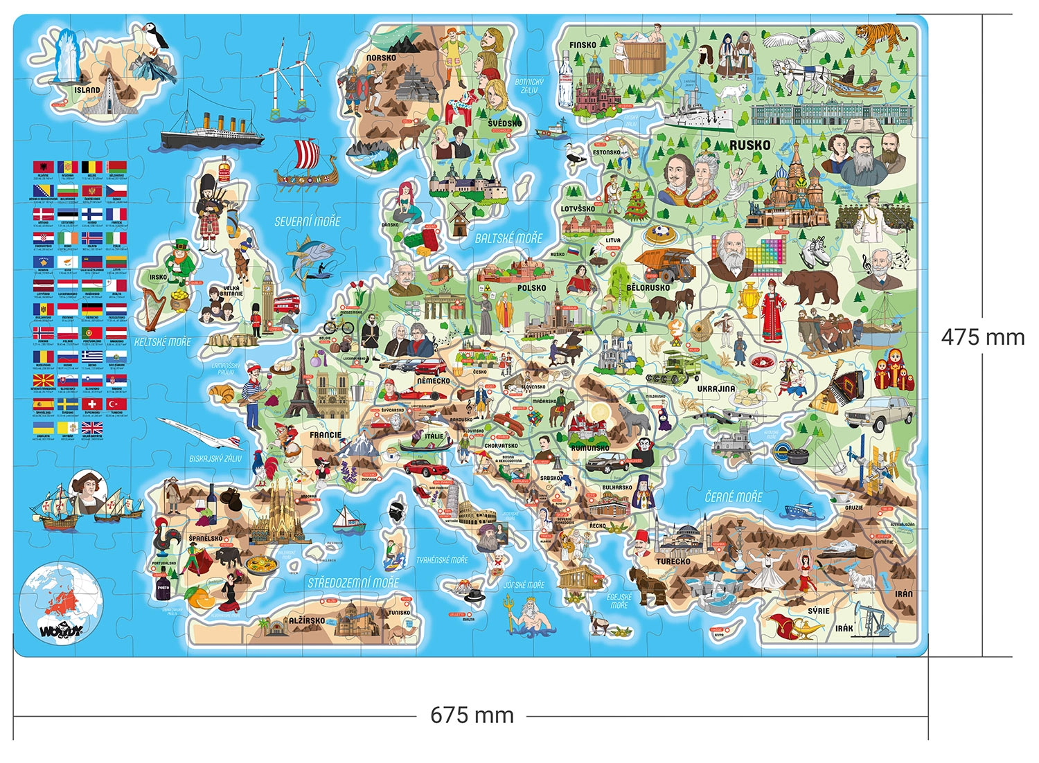Atklājiet Eiropu aizraujošā veidā ar bērnu puzli no 160 gabaliņiem. Kartē atradīsiet ilustrācijas, kas raksturo atsevišķas valstis un to karogus, visi uzraksti ir čehu valodā. Liekšana attīsta vērīgumu, prasmi un koncentrēšanos, bet krāsainie dzīvnieku, augu un ievērojamu vietu attēli veicina iztēli un ģeogrāfijas zināšanas.