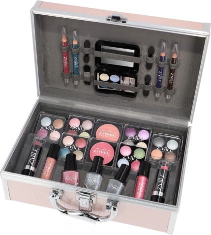 Stilīgs rozā kosmētikas koferītis Eye-Catcher ar iebūvētu spoguli piedāvā pilnu grima komplektu ar kopumā 42 vienībām. Tajā atradīsiet 24 acu ēnas, nagu lakas, tostarp mirdzošo, vaigu sārtumu, lūpukrāsas un spīdumus, acu zīmuļus un arī aplikatorus un otiņu. Dermatoloģiski testēts un atbilst stingriem ES standartiem.