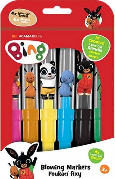 Pūšamo flomāsteru BING komplekts iepriecinās visus mazos māksliniekus. Sešas košas krāsas un tematiski šabloni ļauj viegli veidot oriģinālus zīmējumus ar iemīļotajiem tēliem. Vienkārša pūšana caur flomāsteri rada smalkas pārejas un aerosola efektu bez nekārtības.