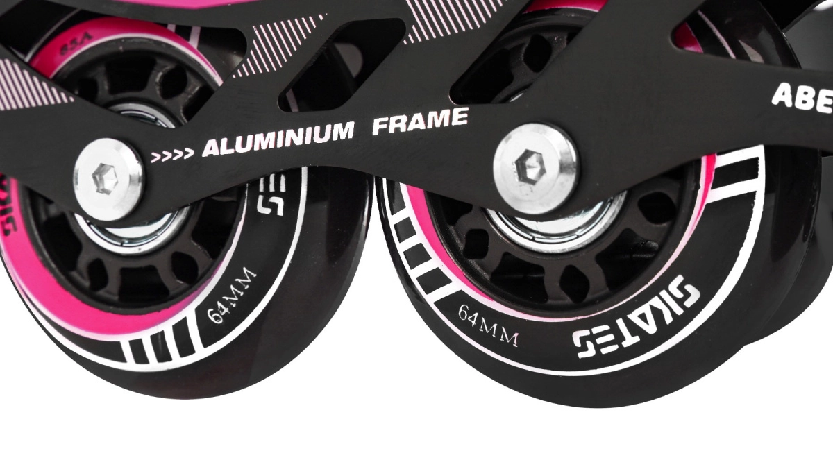 Alumīnija rāmis, ABEC 7 gultņi un PU ritenīši 64×24 mm (85A) nodrošina gludu slīdējumu un ilgu kalpošanas laiku.
