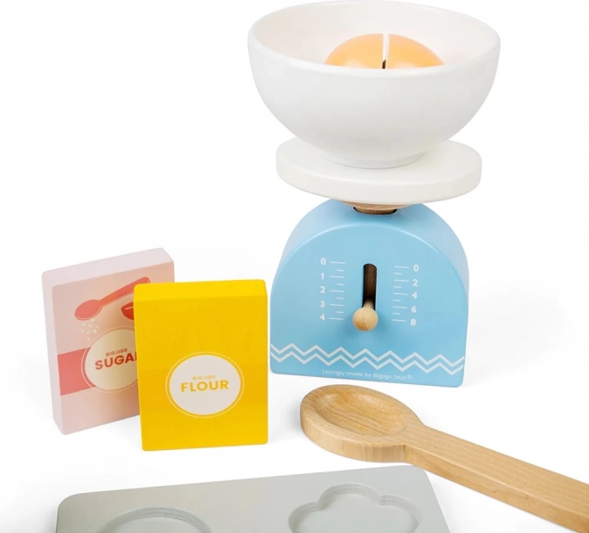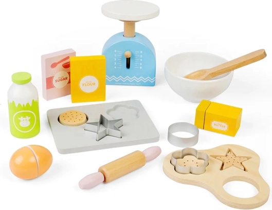 Ar šo bērnu koka cepšanas komplektu jūs varat sniegt stundām ilgu izklaidi un vienlaikus veicināt viņu iztēli. Komplektā ietilpst koka cepampanna, svari, formiņas, rullītis, bļoda, sviests, olas, milti, cukurs un piens. Drošība virtuvē tiek apgūta rotaļīgi un jautri.