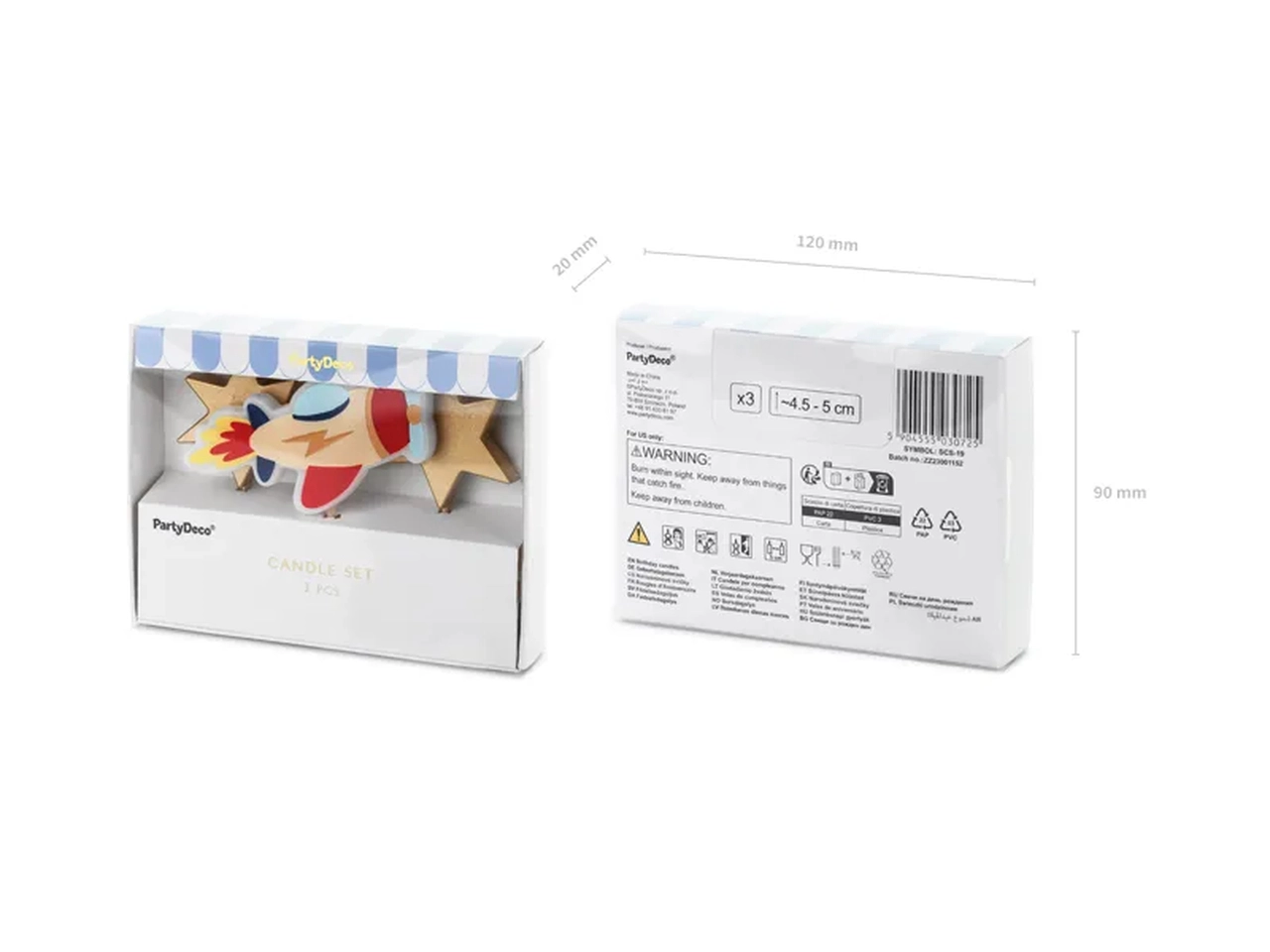Šīs dekoratīvās sveces ienes prieku un gaismu jebkurās bērnu dzimšanas dienas svinībās. Komplektā ir svece raķetes formā košās krāsās, kas uz tortes izcelsies kā izklaides centrālais elements. Sānos atrodas divas sveces zelta zvaigžņu formā, kas svinībām piešķir kosmiskā piedzīvojuma noskaņu.