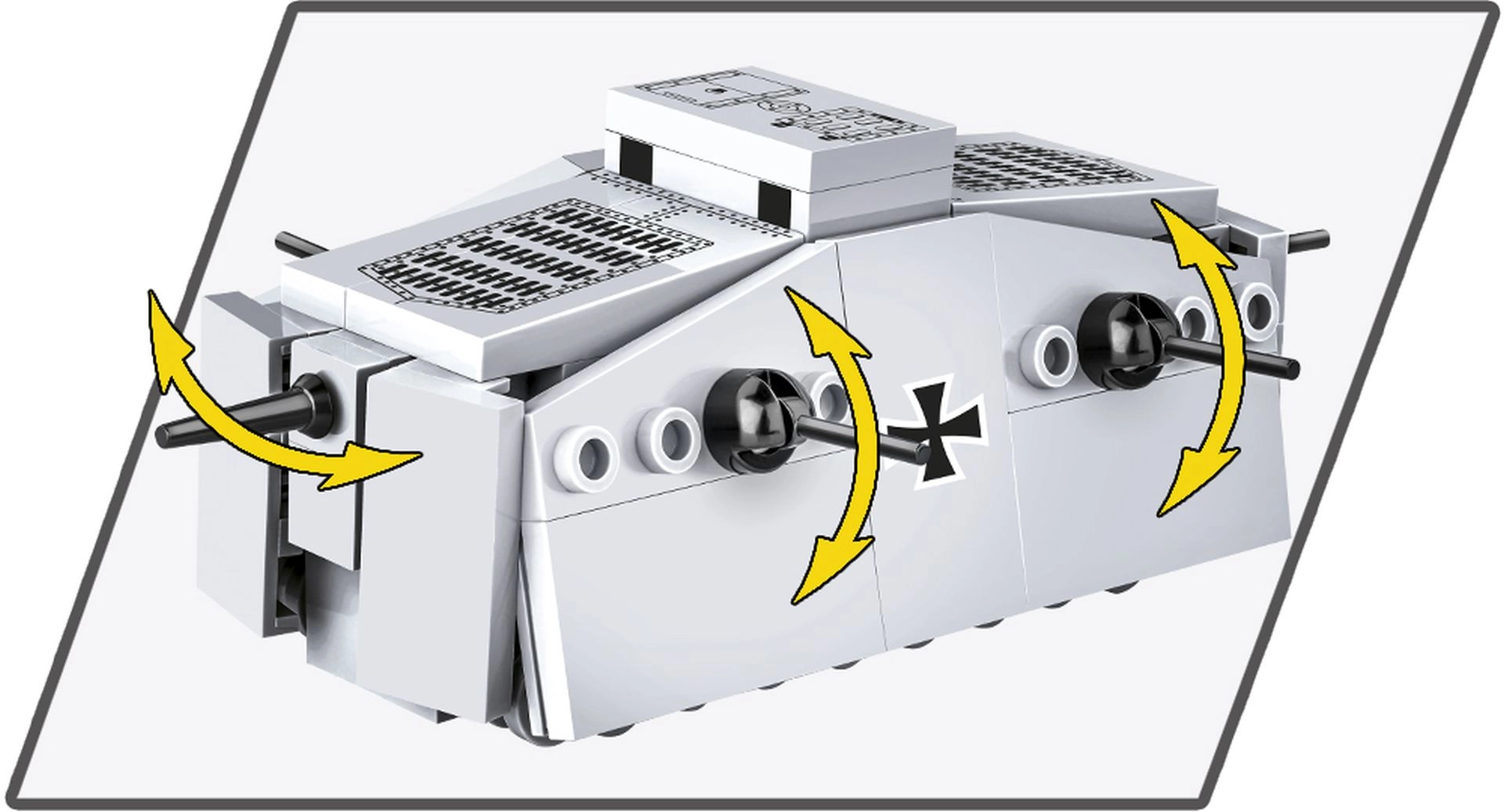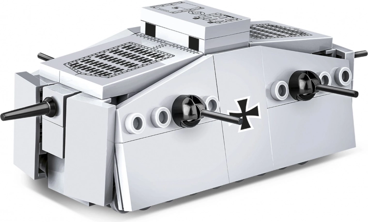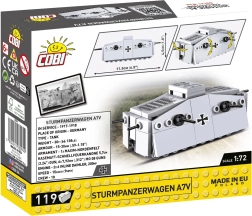 Sturmpanzerwagen A7V bija pirmais vācu tanks, kas tika izmantots Pirmā pasaules kara noslēgumā. Šis ikoniskais bruņutehniskās vienības transportlīdzeklis ar līdz pat 18 karavīru apkalpi bija aprīkots ar 57 mm Nordfeld lielgabalu un sešiem MG 08 ložmetējiem. COBI modelis mērogā 1:72 ar aptuveni 11,5 cm garumu saglabā oriģināla raksturīgās iezīmes un izceļas ar precīzām krustu, režģu un lūku uzdrukām.