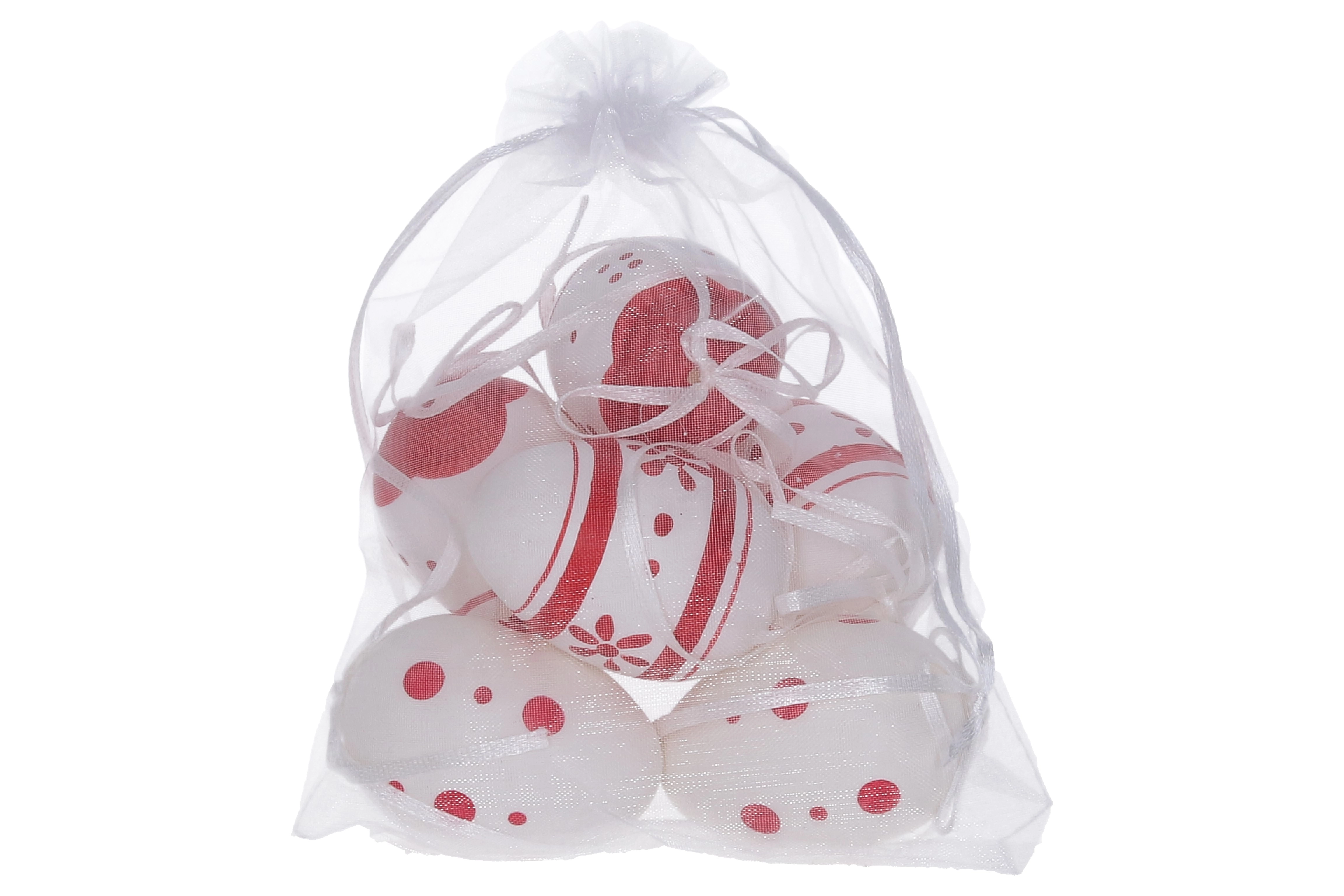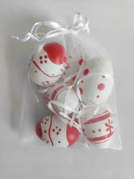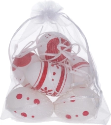 Dekoratīvas krāsotas plastmasas olas ar izmēru 6 cm ir ideālas jūsu svētku dekorācijām. Iepakojumā ir 6 gabali elegantā organzas maisiņā.