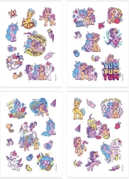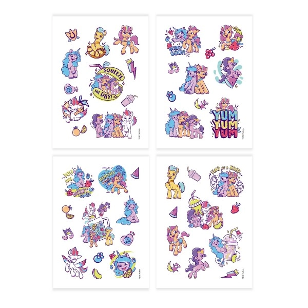 Atklājiet burvīgo poniju pasauli ar MY LITTLE PONY pagaidu tetovējumu komplektu. Katra no 4 loksnēm piedāvā krāsainus un mīlīgus motīvus, kas iepriecinās seriāla fanus un mazos māksliniekus. Uzklāšana ir ātra un droša: izvēlēto attēlu pielieciet pie ādas, samitriniet, noņemiet papīru – un viss gatavs.