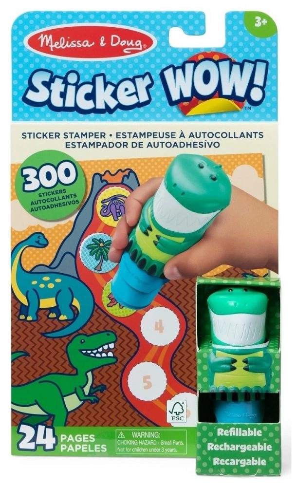 Dinozaura formas spiedogs ļauj viegli radīt krāsainas uzlīmes ar aizraujošiem aizvēsturiskajiem motīviem. Bērni var veidot savus scenārijus un stāstus.
