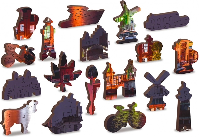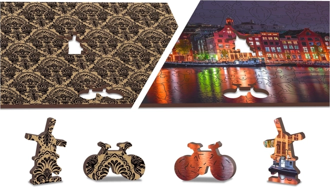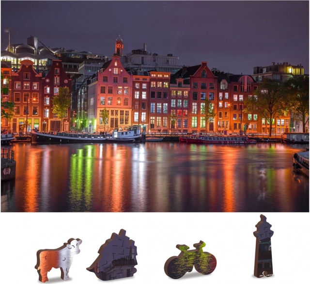 Šī unikālā koka puzle iepriecinās ikvienu salikšanas cienītāju. Pateicoties lāzergriezumam, puzles gabaliņiem ir gludas malas, kas viegli savienojas. Komplektā kopā 150 gabaliņi, no kuriem 30 ir unikālu formu, piemēram, dzīvnieki vai slavenas ēkas, piešķirot gan izglītojošu aspektu, gan vizuālu estētiku. Puzle ir veidota kā 2v1, tas nozīmē, ka to var salikt gan pēc izsmalcinātā Amsterdamas nakts motīva, gan pēc formas, vadoties pēc raksta aizmugurē.