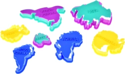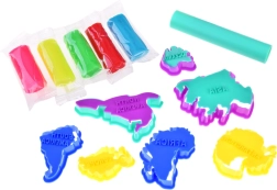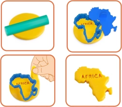 Komplektā ir viss nepieciešamais: modelēšanas masa piecās krāsās, 7 kontinentu formiņas, 7 zīmogi ar kontinentu nosaukumiem un rullītis. Vienkārši izrullējiet plastilīnu plānā kārtā un ar izgriezējformām izveidojiet izvēlētos kontinentus.