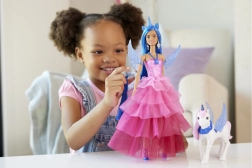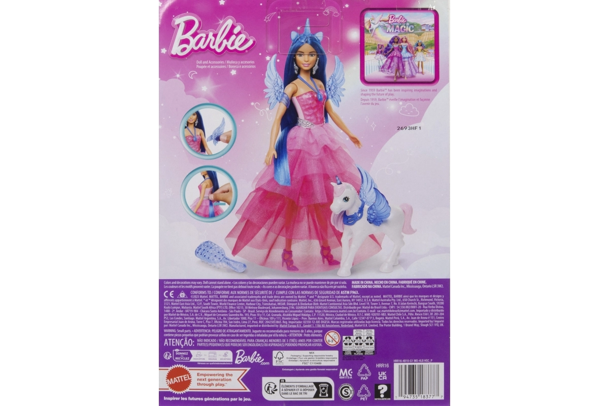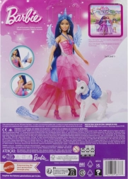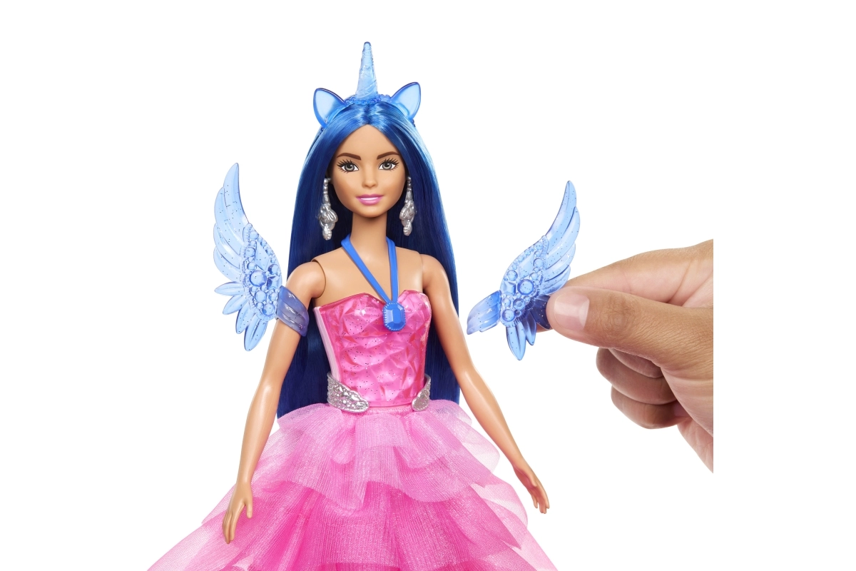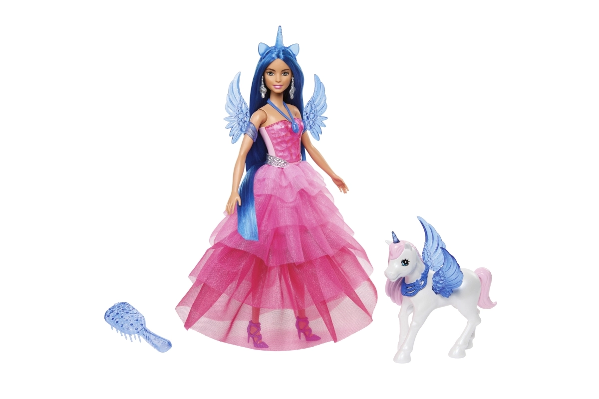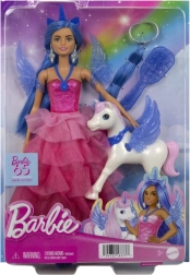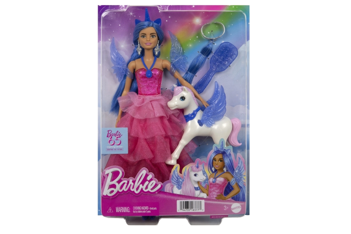 Sviniet BARBIE 65 gadu jubileju ar burvīgu princeses un viņas alikorna komplektu! Lelle ar garām zilām matu šķipsnām, rozā kleitu un noņemamiem spārniem un asti iedvesmo bezgalīgai fantāzijai. Komplektā ir stīpiņa ar ragu, sudrabotas auskari, stilīgi apavi un suka matu ķemmēšanai. Komplektu papildina spārnots vienradzis maģiskiem stāstiem.