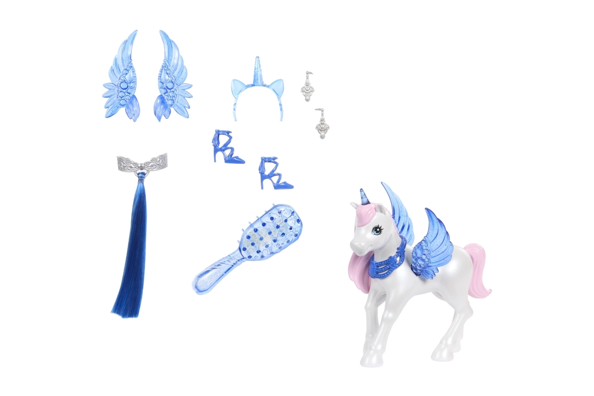 Radiet savus pasakainos stāstus: pievienojiet zilus noņemamus spārnus, uzlieciet stīpiņu ar vienradža ragu un pabeidziet tēlu ar alikorna asti. Uzticams sabiedrotais ir mīļš vienradzis ar caurspīdīgiem spārniem, kas piešķir spēlei vēl vairāk maģisku mirkļu.