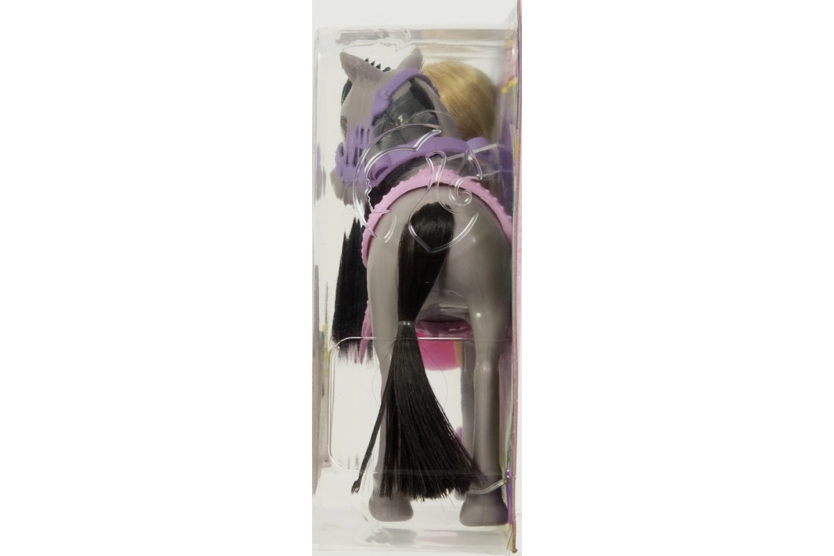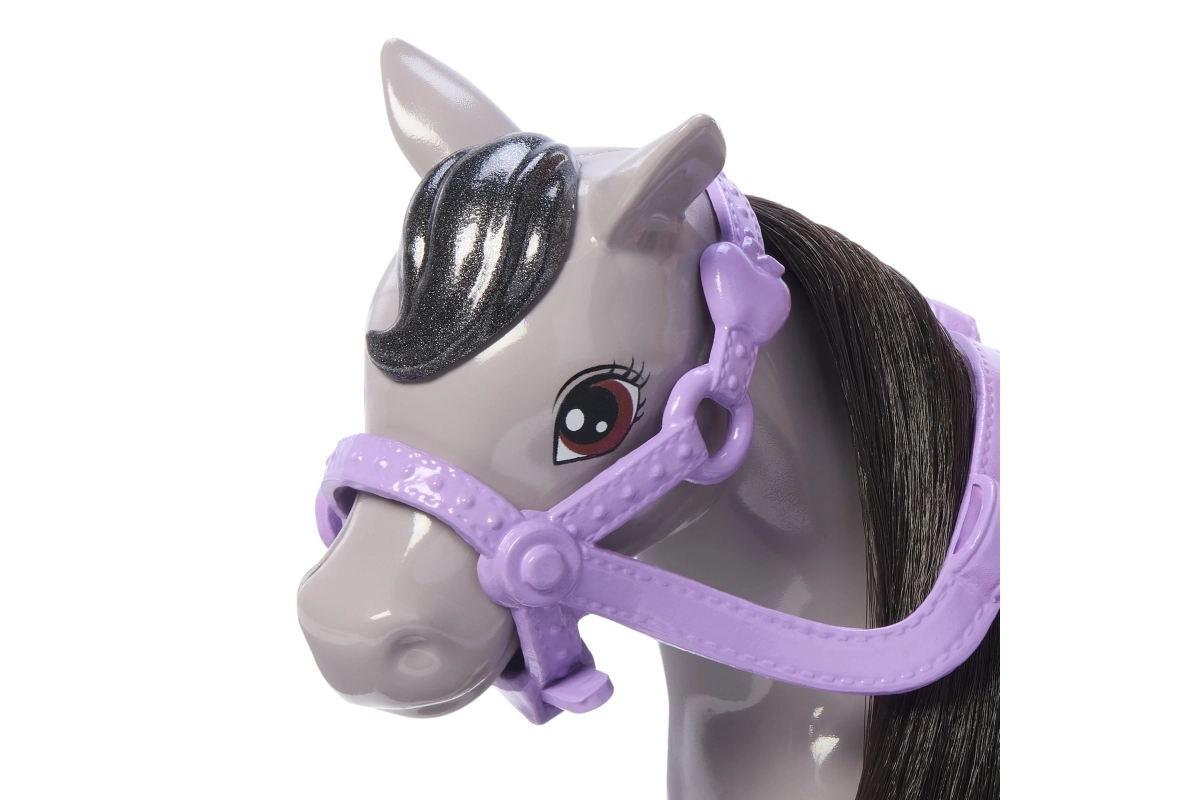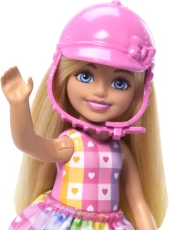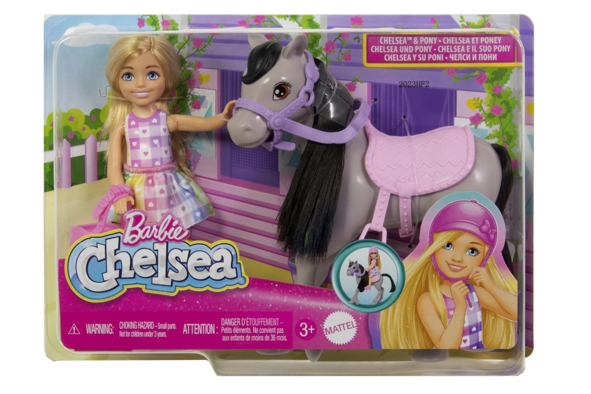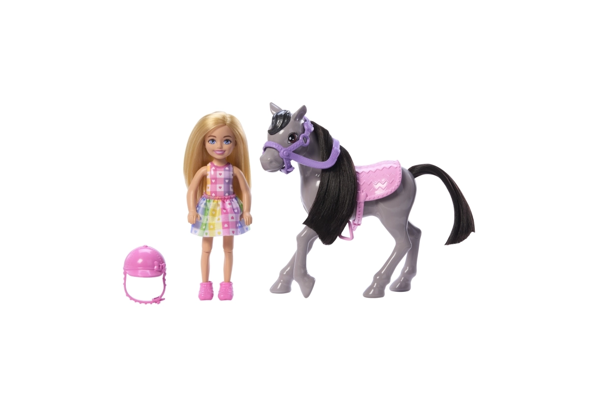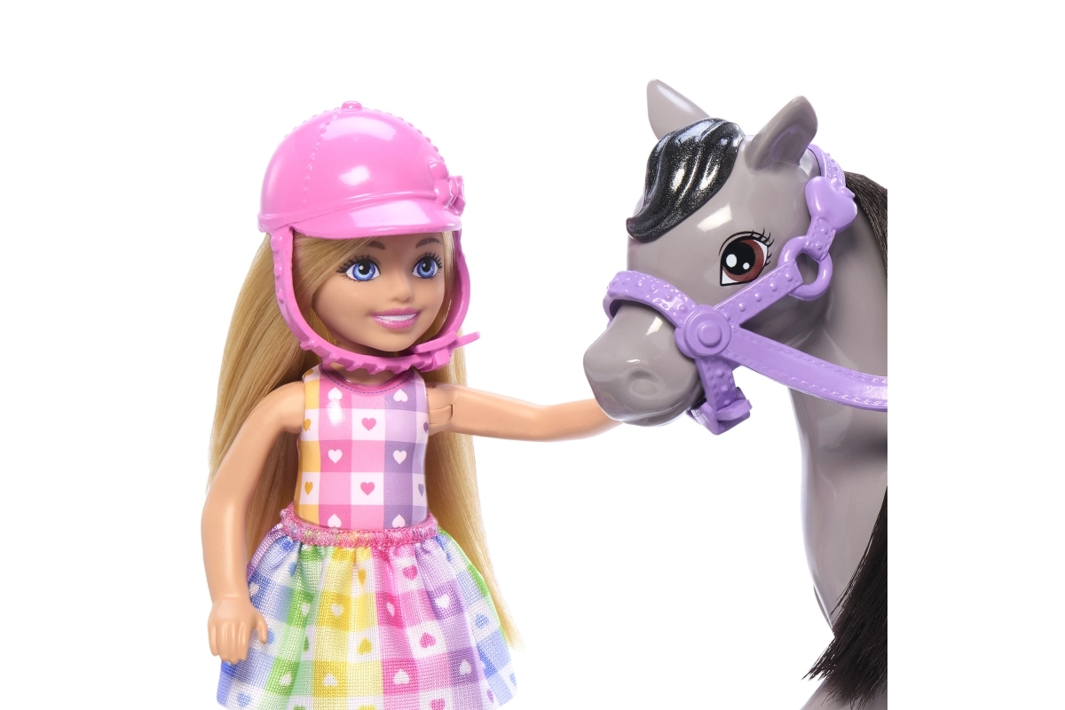 Rotaļu komplekts Barbija Čelsija uz ponija sniedz bērniem daudz prieka un iedvesmo iztēli. Čelsija uzliek drošības rozā ķiveri, iesēžas ērti rozā seglos un, pateicoties liekamiem ceļgaliem un kāpšļiem, dodas stilīgā izbraucienā. Pelēkais ponijs ar violetu iemauktu, mīkstu krēpi un asti ir radīts kopšanai un maigiem glāstiem.