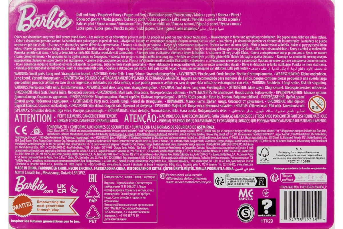 Komplekts veicina sīko motoriku, iztēli un lomu spēles. Ideāla dāvana bērniem no 3 gadu vecuma, kuri mīl zirdziņus, lelles un BARBIE pasauli. Krāsas un dekorācijas var atšķirties.