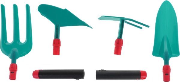 Praktiskie noņemamie rokturi atvieglo rīku pārnēsāšanu un glabāšanu. Vieglā un izturīgā konstrukcija ir ideāla pirmajiem dārzkopības mēģinājumiem dārzā, uz balkona vai puķupodā.