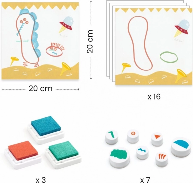 Zīmogu komplekts bērniem ar briesmoņu motīviem sniedz izklaidi un veicina mazo mākslinieku radošumu. Bērni var eksperimentēt ar dažādām kombinācijām un veidot mīlīgus attēlus.