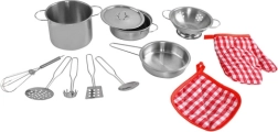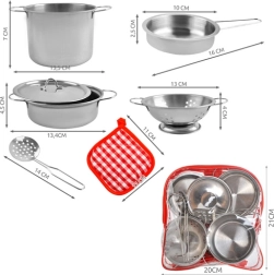 Šis reālistiskais metāla katlu un piederumu komplekts ir ideāli piemērots bērnu virtuvēm un spēlēm mājās, kafejnīcā vai restorānā. Klasiskais sudrabainais izskats lieliski sader ar jebkuru bērnu stūrīti, un universālais vāks der visiem katliem. Pateicoties vieglai konstrukcijai un kompaktajiem izmēriem, visu komplektu ir viegli pārnēsāt un novietot.