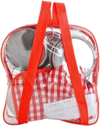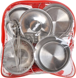 Pilns virtuves komplekts mazajiem pavāriem ar kopā 13 daļām praktiskā caurspīdīgā mugursomā. Iekļauti metāla katli, panna, sietiņš, universāls vāks un virtuves piederumu komplekts, ko papildina tekstilīga pannaura un paliktnis. Viegls, pārnēsājams un izturīgs komplekts veicina bērnu radošumu, motoriku un sociālo spēli.