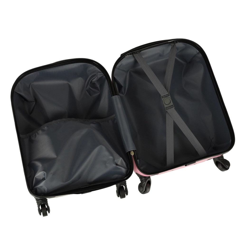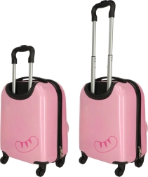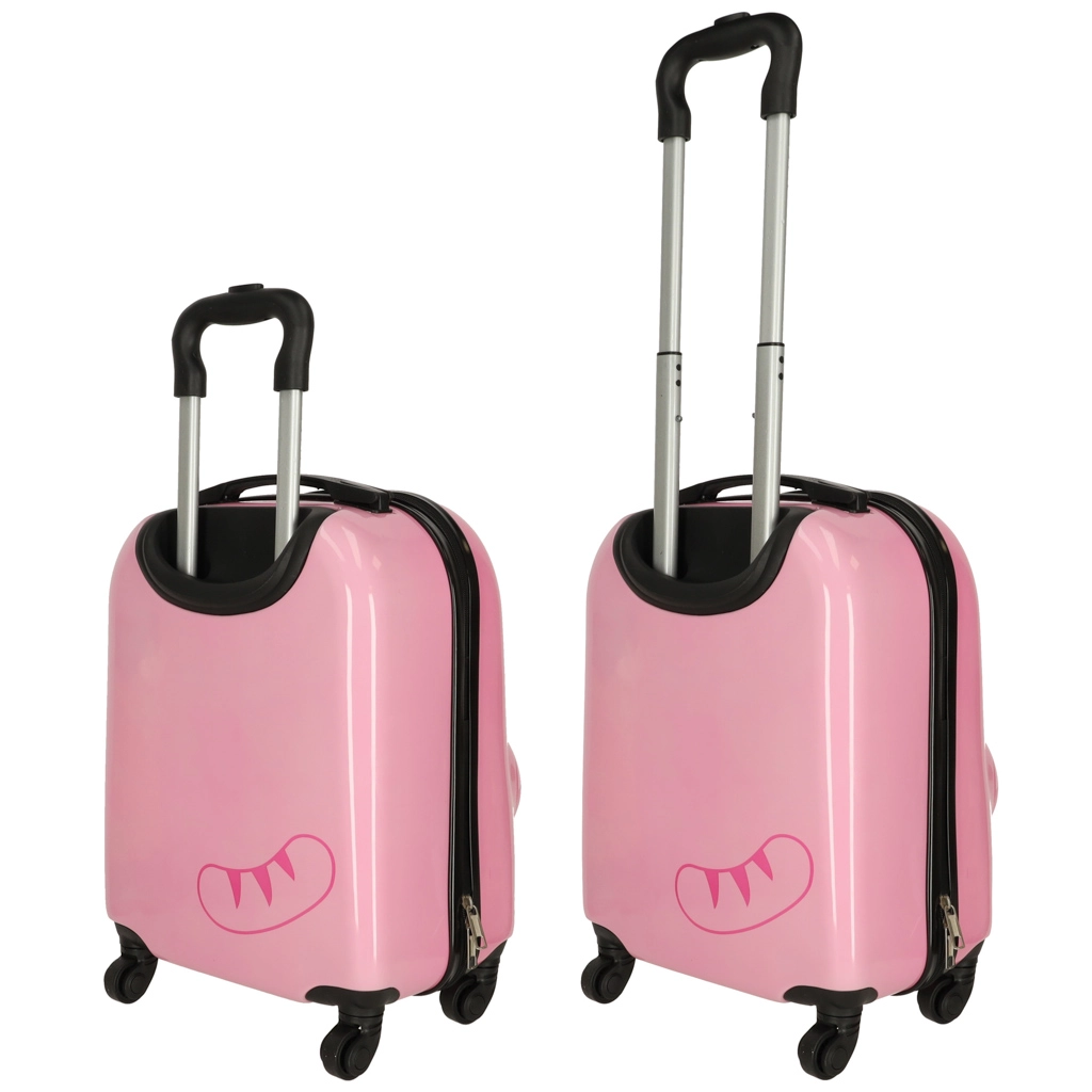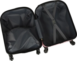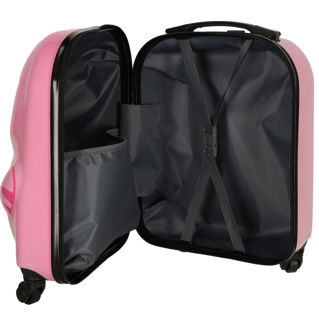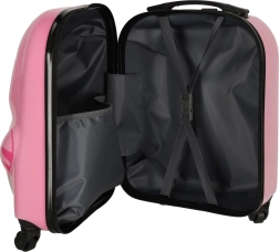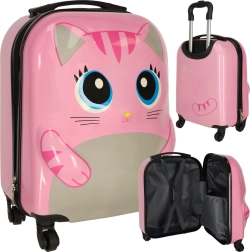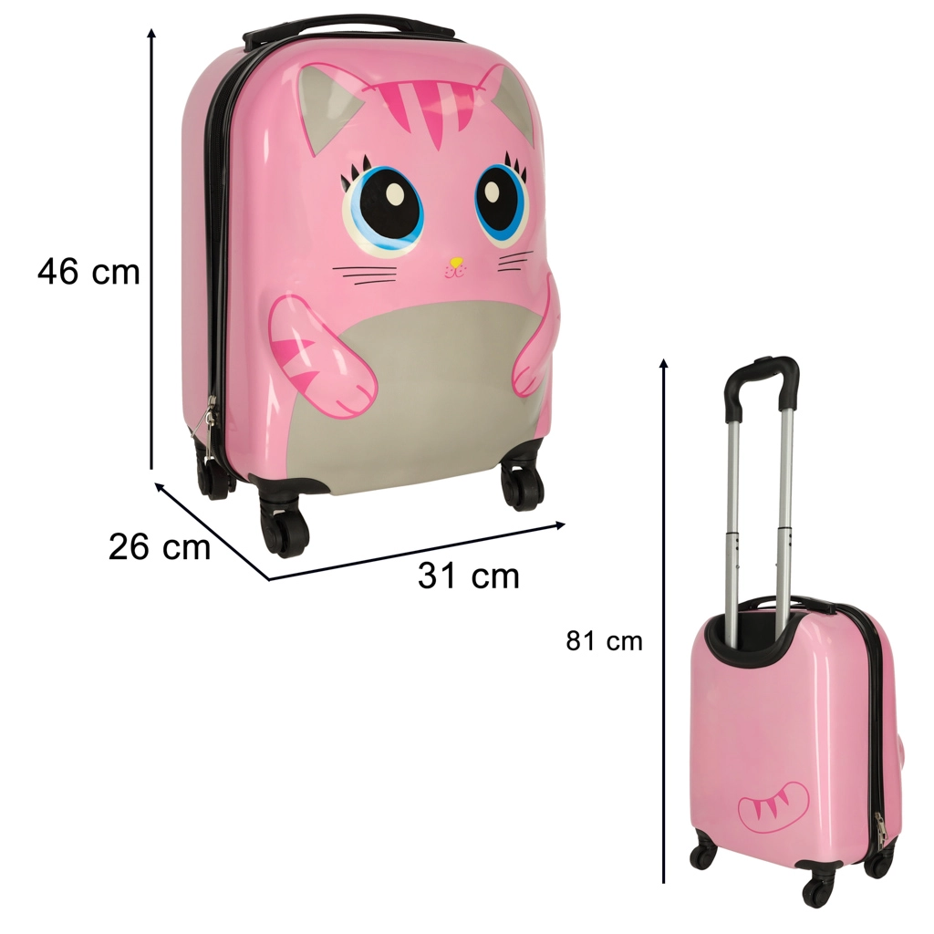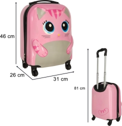 Mīlīgs bērnu čemodāns ar kaķa motīvu rozā krāsā pārvērtīs ikvienu ceļojumu jautrā piedzīvojumā. Pateicoties četriem riteņiem un teleskopiskajam rokturim, to ir viegli vadīt, tam ir liela ietilpība un praktisks iekšējais dalījums ar divām nodalījumu daļām ērtai apģērba un rotaļlietu sakārtošanai. Izturīgais cietā plastmasas korpusa dizains nodrošina vieglumu un ilgu kalpošanas laiku.