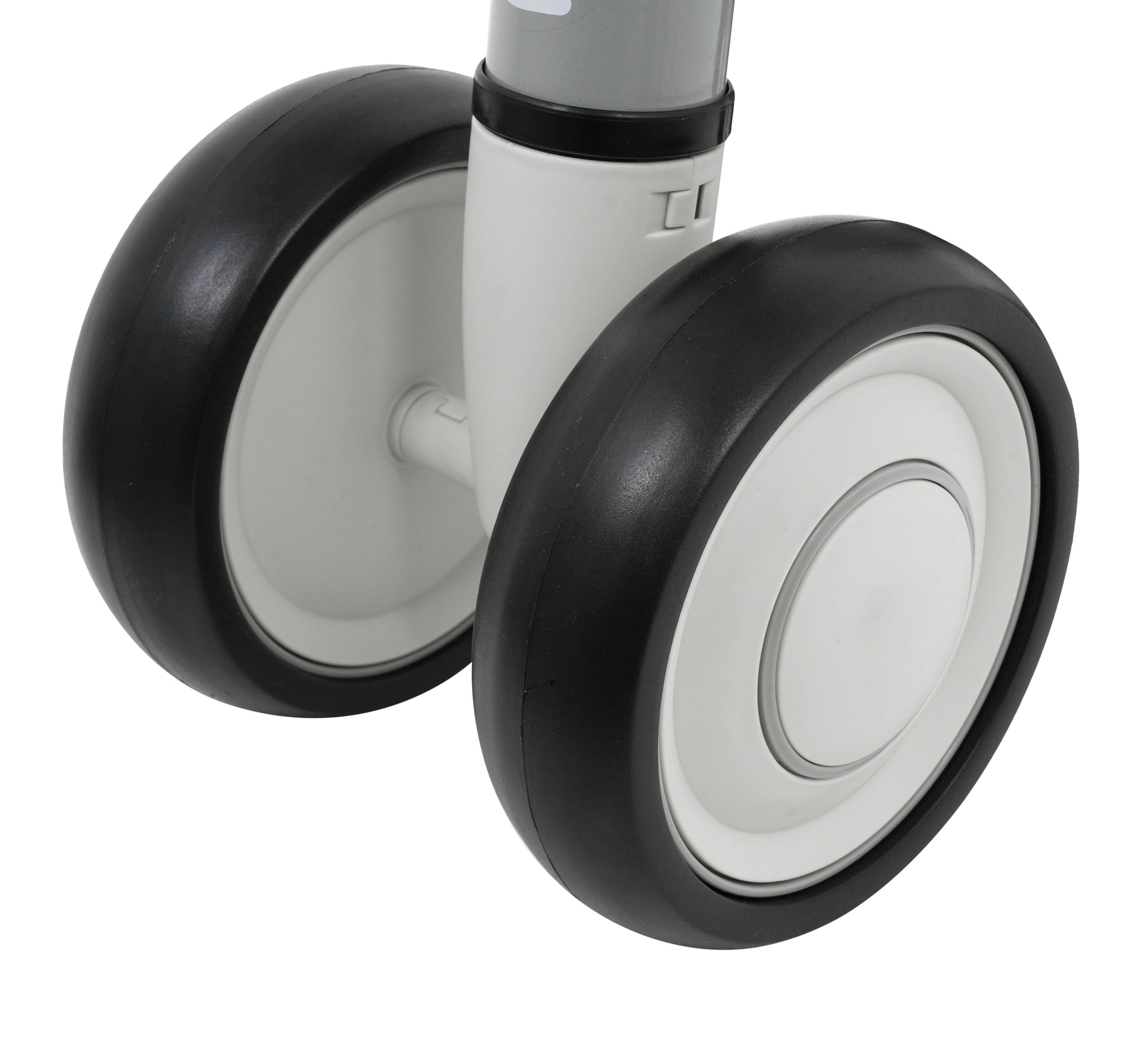 Lieli putu riteņi slāpē nelīdzenumus, nesaskrāpē grīdu un ir klusi – ideāli dzīvoklim un pagalmam.